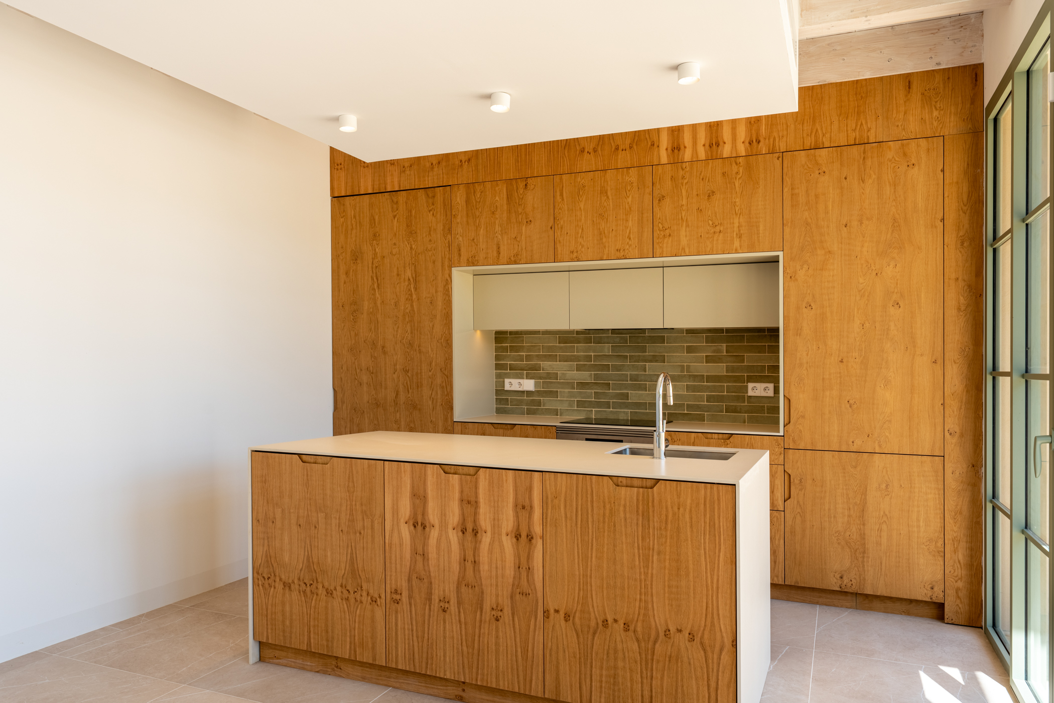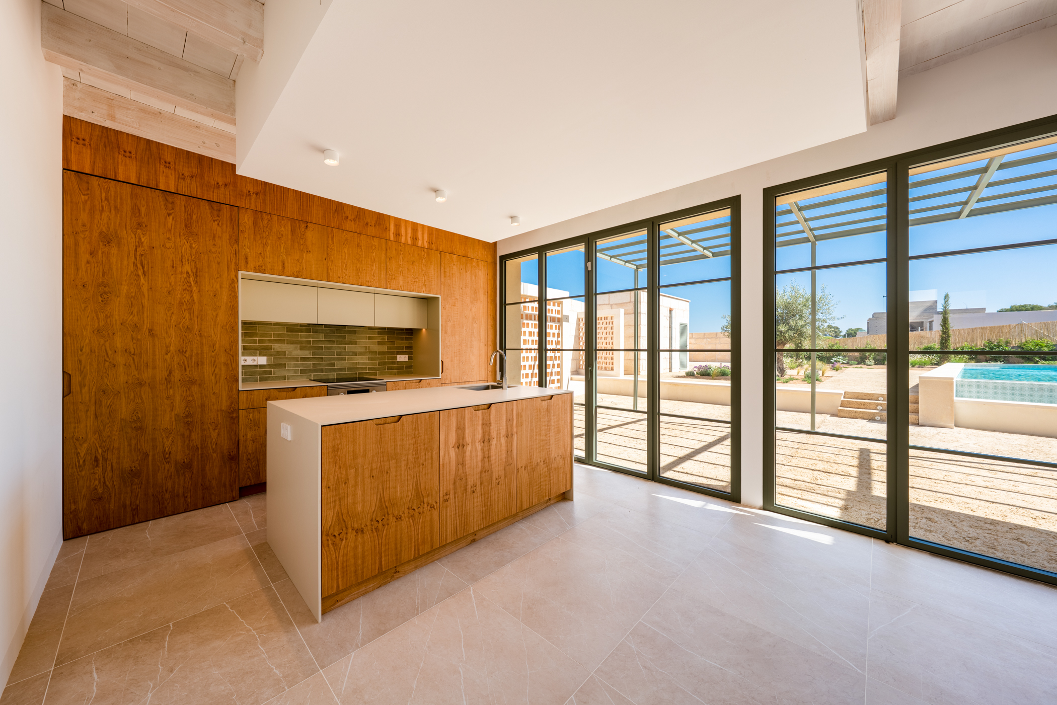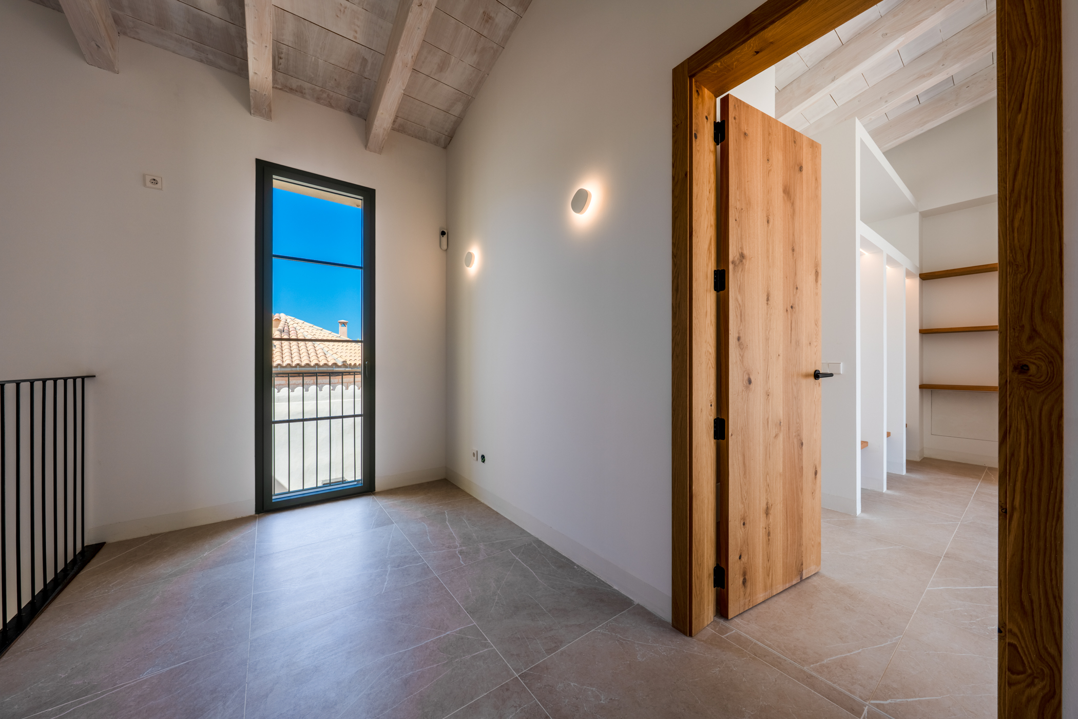 This beautiful house in Llubi, located on a 755 m² plot in the center of Mallorca, not far from the town of Inca, offers a built area of 200 m². The lower living area comprises an entrance hall with double-height ceiling, a living room with fireplace, an open-plan, fully equipped kitchen with cooking island, a utility room, a double bedroom, and a bathroom. The upper living area features two bedrooms with en suite bathrooms and a study or gallery area.