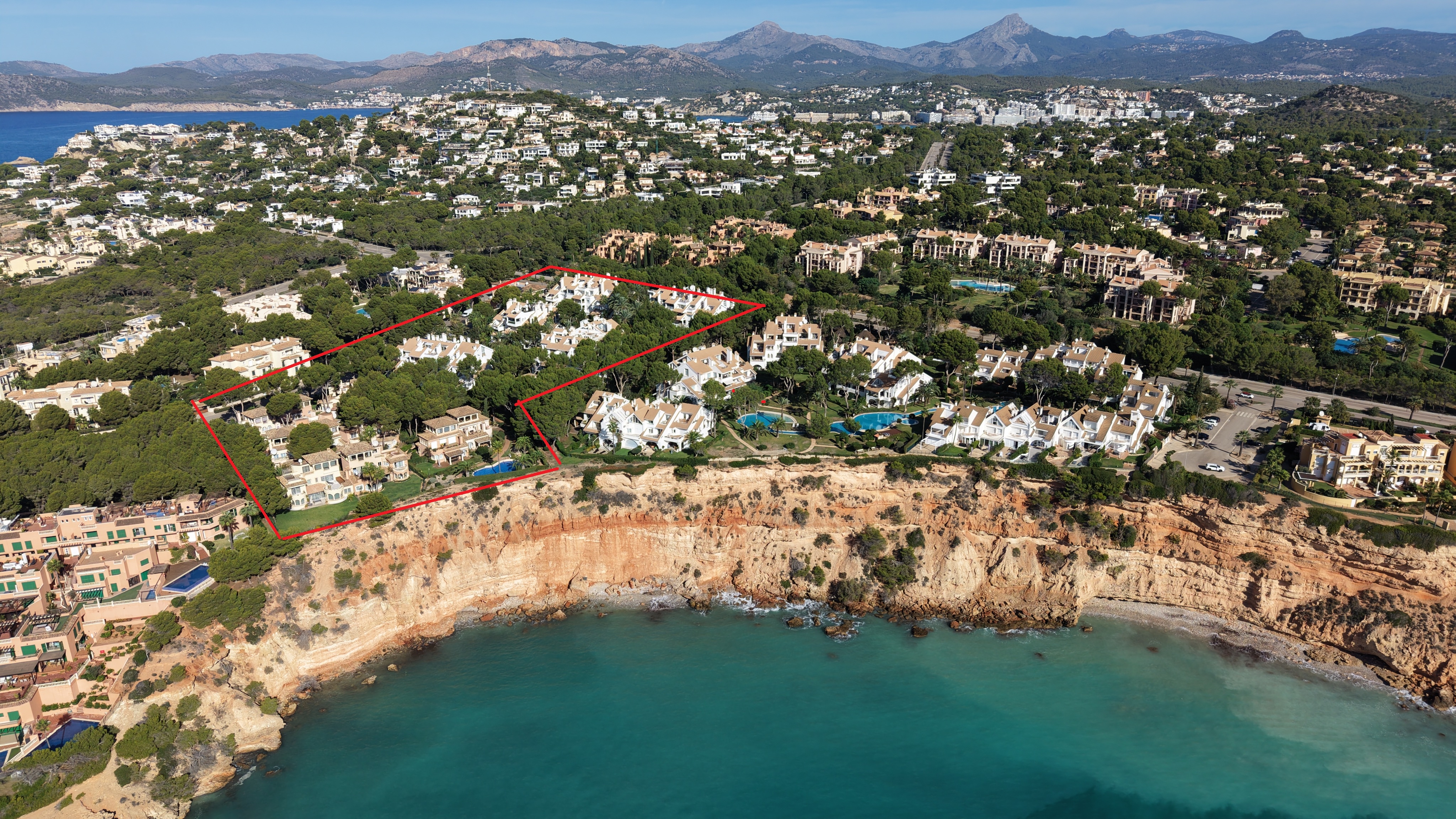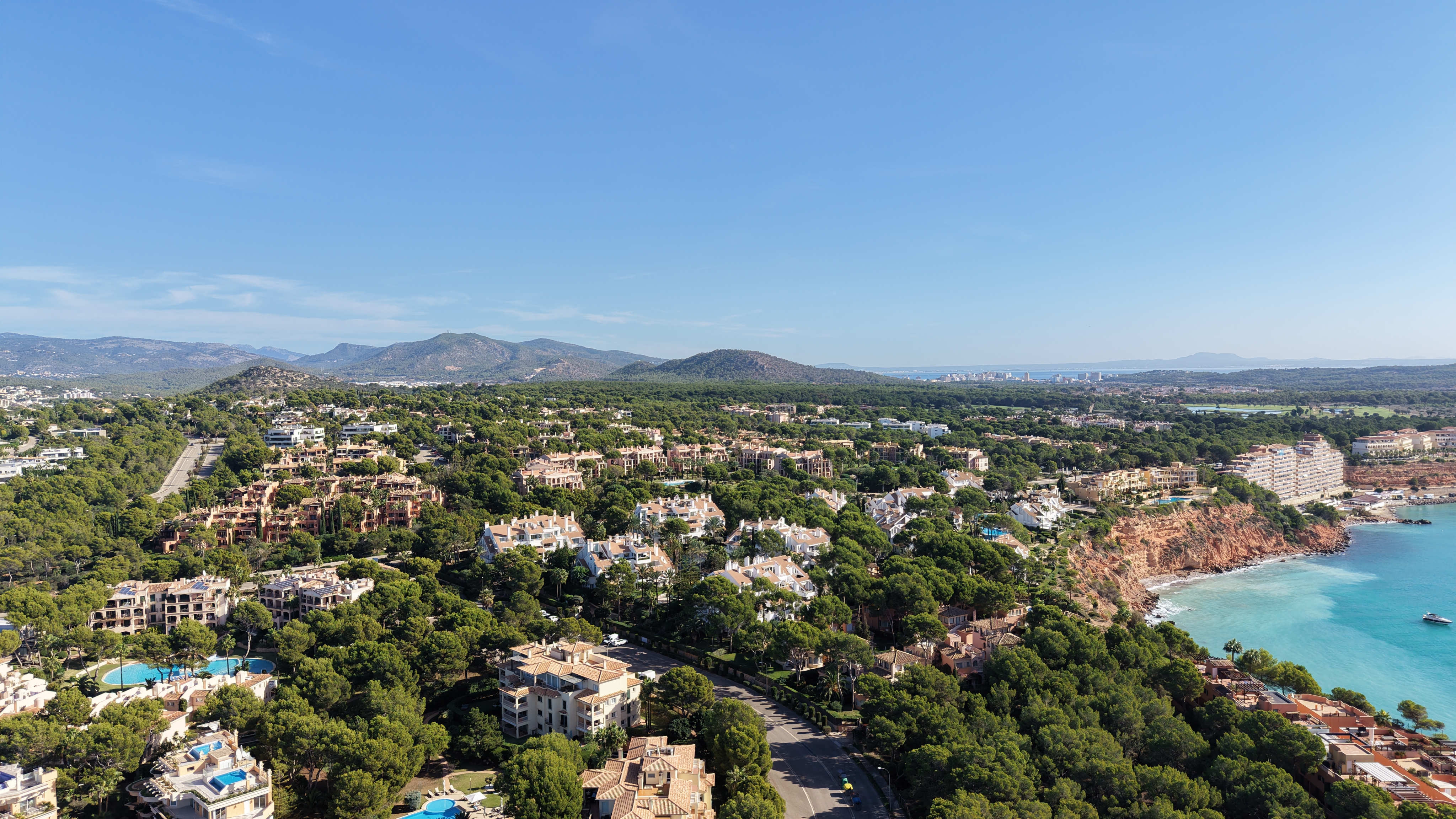 Santa Ponsa – as very sought after holiday location with sandy beach – boasts of all important amenities’ like shops, bars, restaurants, supermarkets, etc., not to forget the marina Club Náutico Santa Ponsa. Close to Santa Ponsa you find the new Santa Ponsa area (Nova Santa Ponsa). Embedded in the Santa Ponsa golf courses I, II & III you find a selection of high-class popular residences at the golf course as well as beautiful luxury villas and residences in first sea line. Numerous sport and leisure activities are given not only through the new MARINA PORT ADRIANO with its adjacent – tourist free – sandy beach. To the Palma city center you get within just an approximately 20 min car drive and to the international airport you need just approximately 30 min. by car.