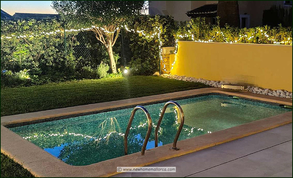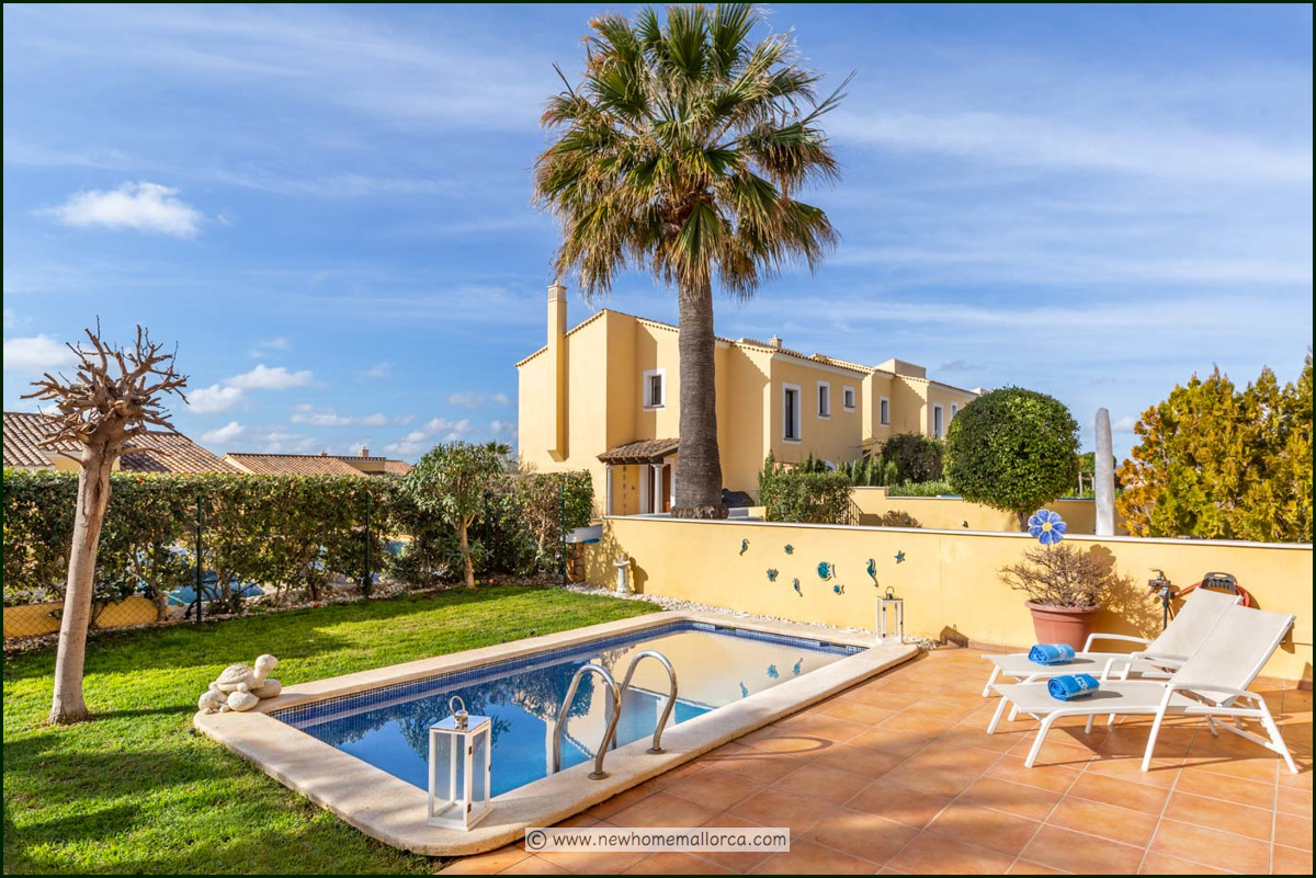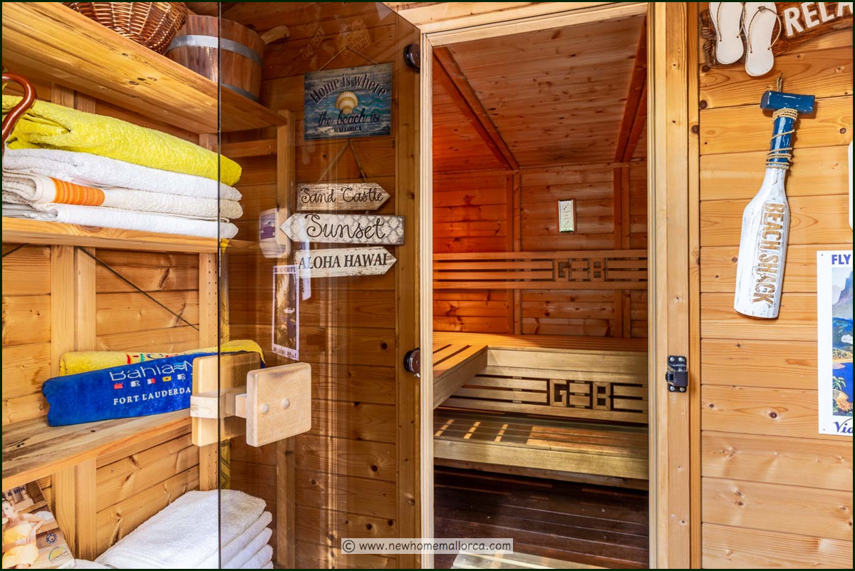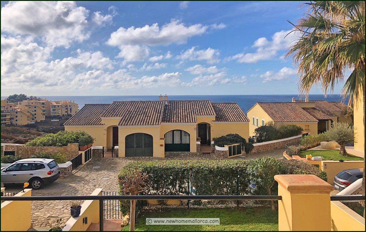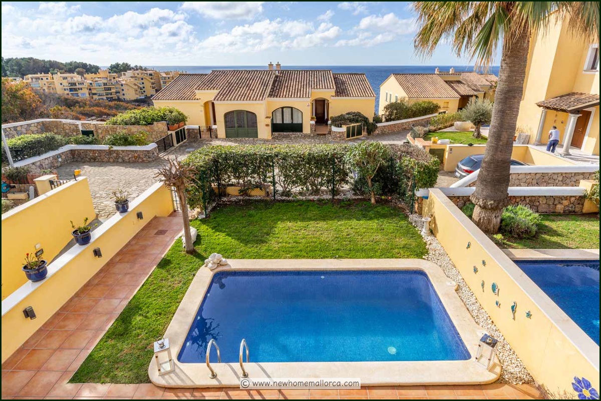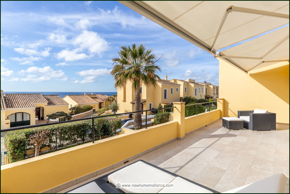 This terraced house in Nova Santa Ponsa is situated on a plot of approx. 500 m2 in the popular first sea line residence “MAR DEL SUR” in Nova Santa Ponsa in the southwest of the island. A living area of approx. 114 m2 is divided over two living levels into the living/dining room with a new modern and fully equipped kitchen integrated into the living room, a modernized shower room and a guest toilet in the lower main living area. In the upper living area there is the master bedroom with en-suite bathroom and access to a large terrace with stunning sea views and a further double bedroom with en-suite bathroom. From the main living area, stairs lead down to the utility room, which also offers plenty of storage space. From here there is direct access to a communal underground car park for 4 terraced houses. Two underground parking spaces are included in the price of the property. The living area leads out to a beautiful covered terrace area and a small private garden with a small swimming pool. There is also a separate sauna at the rear of the house. Wonderful communal gardens and a marvellous communal pool area with children’s pool complete the offer of this fantastic terraced house with sea views in Santa Ponsa. There is the possibility of generating a 3rd bedroom.
