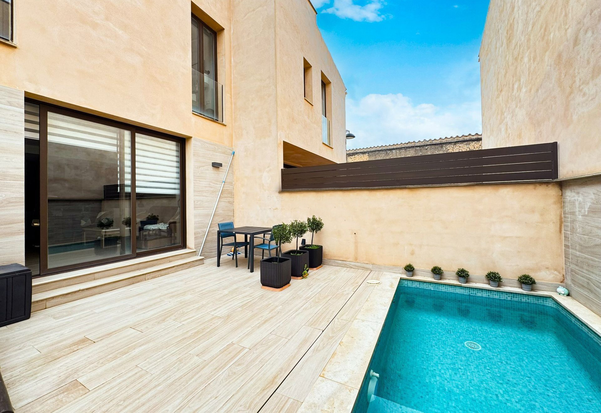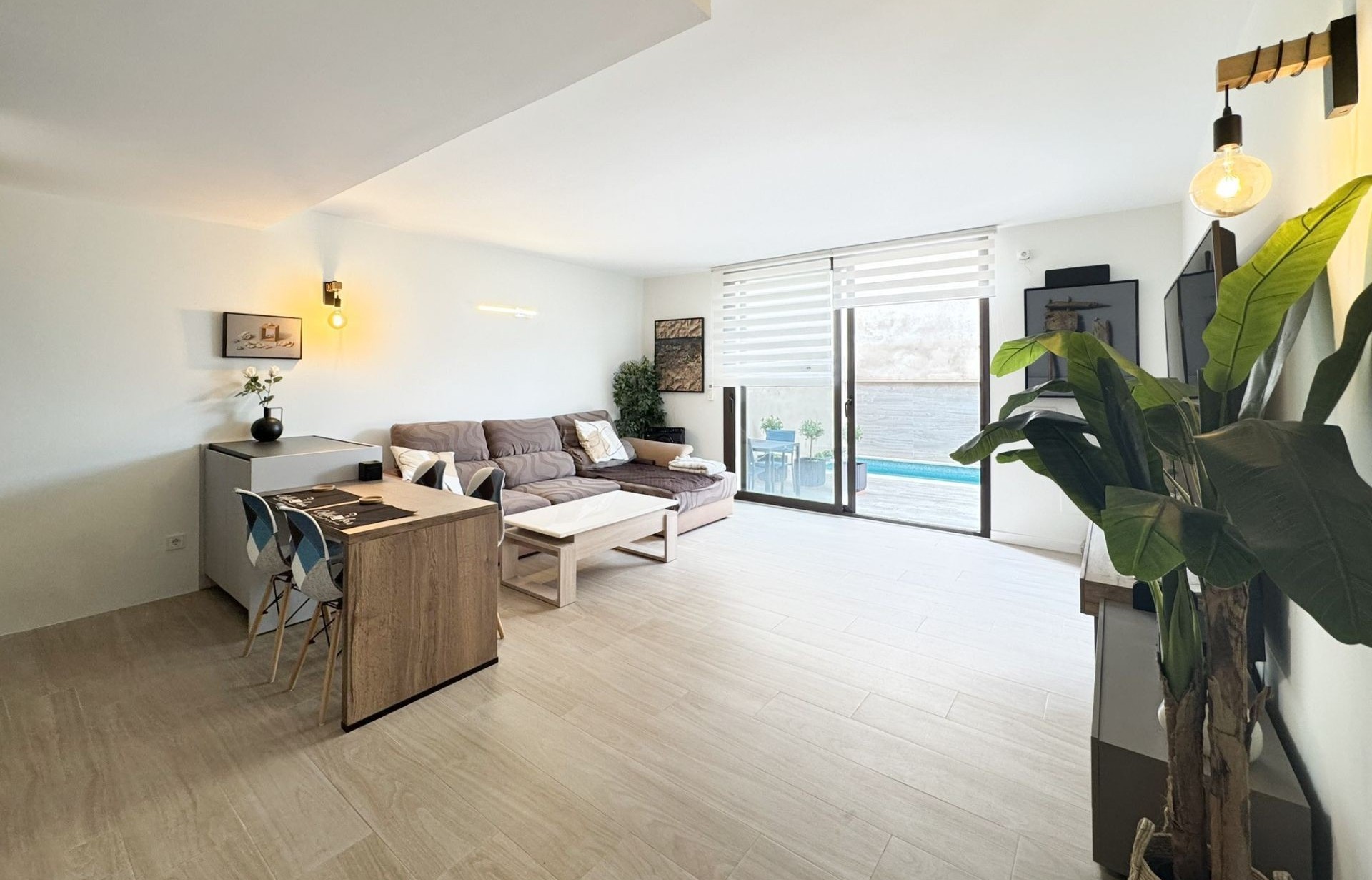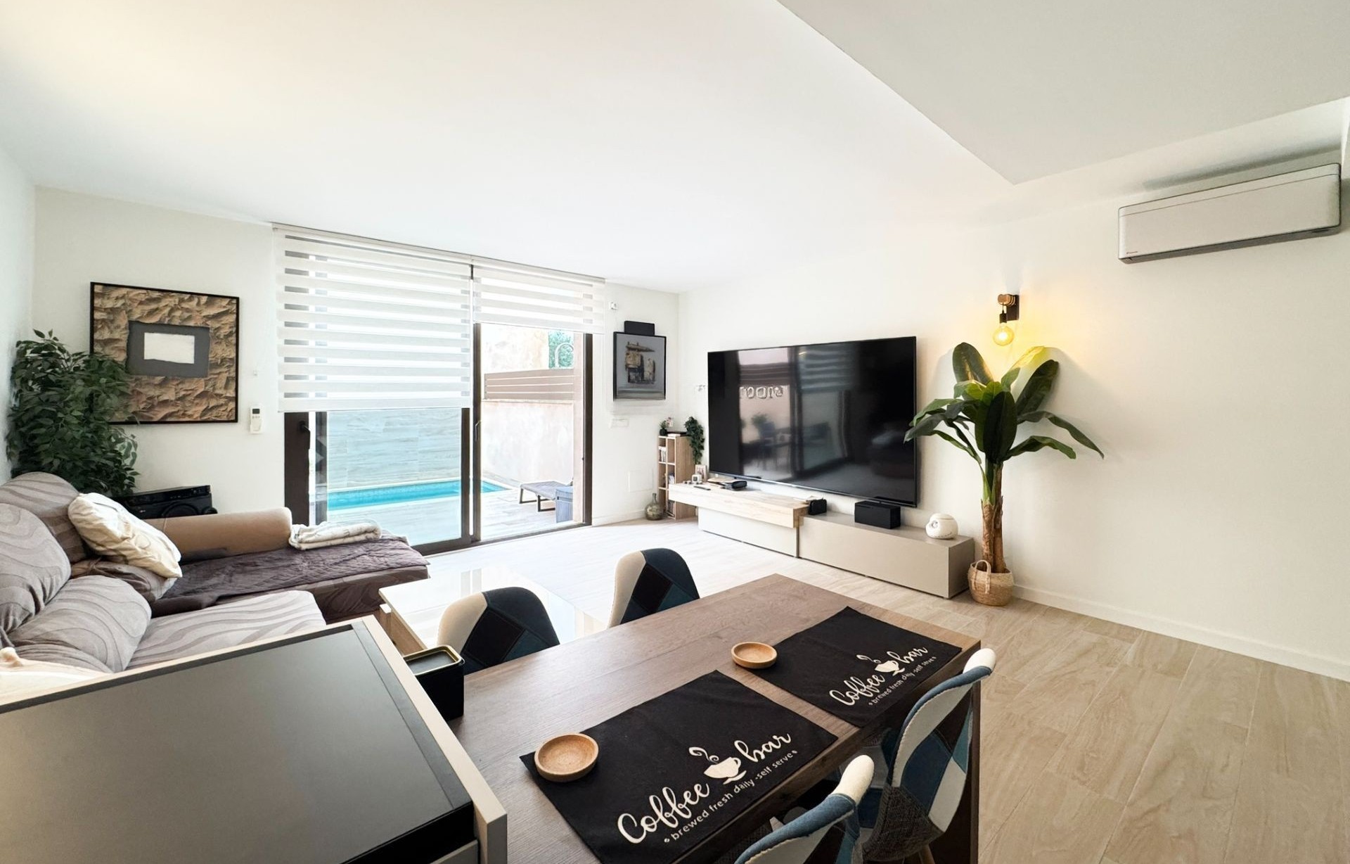 This beautiful terraced house was built in 2020 and offers a living area of 126 m² with a living/dining room with an open-plan, fully equipped kitchen, a guest toilet, the master bedroom with en-suite bathroom, two further bedrooms and a separate shower room. A garage and a terrace with a private swimming pool complete the offer.