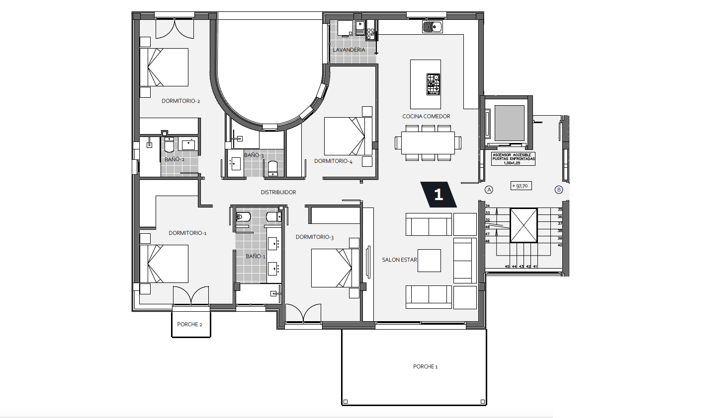 Calefacción por suelo radiante, aire acondicionado frío/calor, suelos de baldosas, lavadero, armarios empotrados, ventanas de aluminio con doble acristalamiento, ascensor, plaza de aparcamiento subterráneo, sistema de video portero, cocina de lujo de alta calidad y totalmente equipada con isla de cocción y electrodomésticos MIELE, puerta de entrada de seguridad, terraza.
