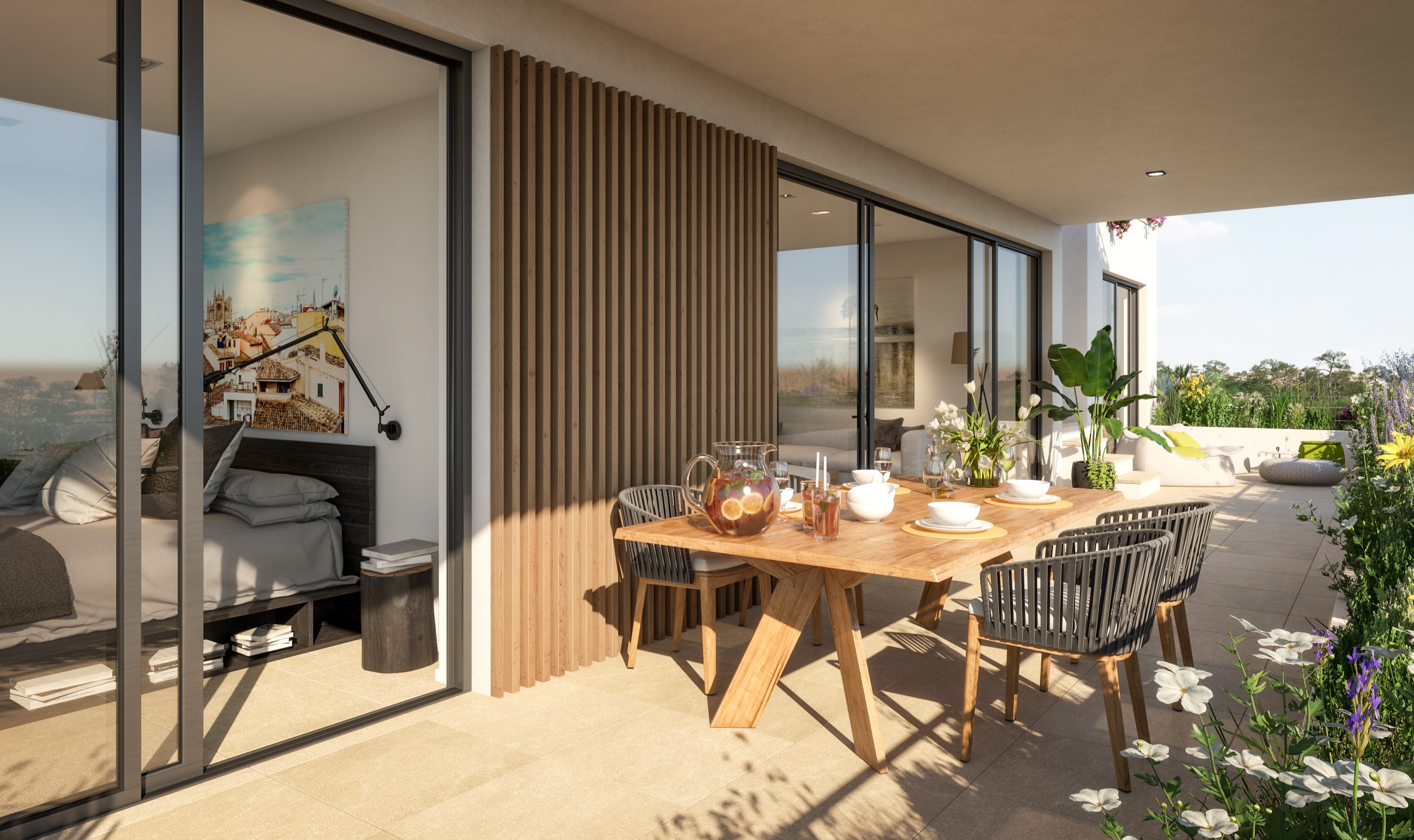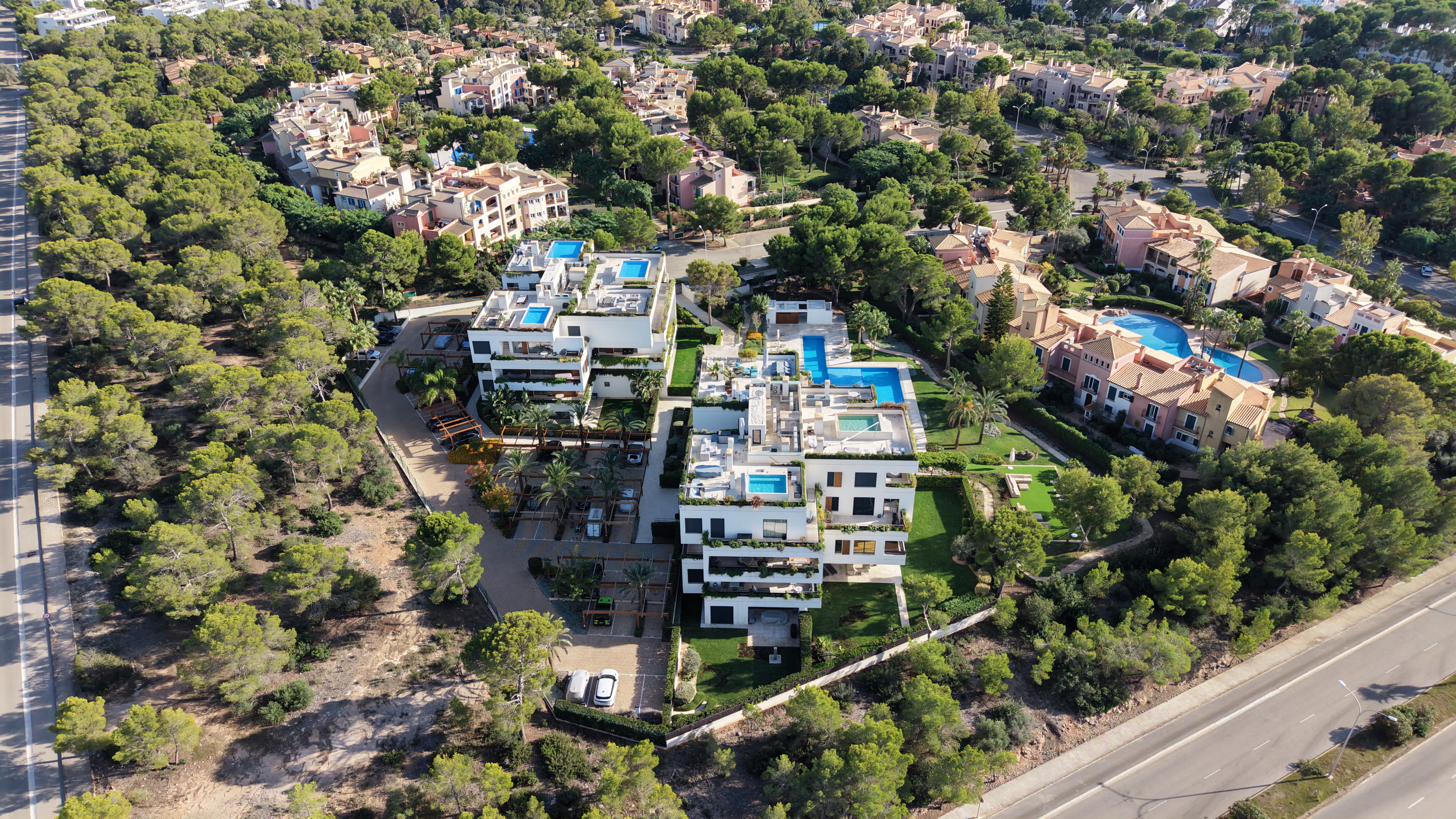 Diese wundervolle modernen Penthaus wurde im Jahr 2020 erbaut und befindet sich in der Luxus-Residenz „Green Elements“ in Nova Santa Ponsa im Südwesten von Mallorca. Das Penthaus bietet durchweg hochwertige Bau- und Ausstattungsqualitäte und modernste Haustechnik und verfügt bei einer Wohnfläche von ca. 130 m2 über das helle Wohn-/Esszimmer mit Zugang zu einer Terrasse mit herrlichem Meerblick mit einer offenen und voll ausgestatteten Luxus-Küche, zwei großzügige Doppelschlafzimmer mit jeweils einem Badezimmer en Suite und eine Gäste-Toilette. Highlight ist sicherlich die fabelhafte Dachterrasse mit Grillplatz und einem Swimming-Pool. Zwei überdachte Carport-Stellplätze und ein wundervoller Gemeinschaftsbereich mit Swimming-Pool auf Salzwasserbasis und herrlich angelegten Garten runden das Angebot ab.