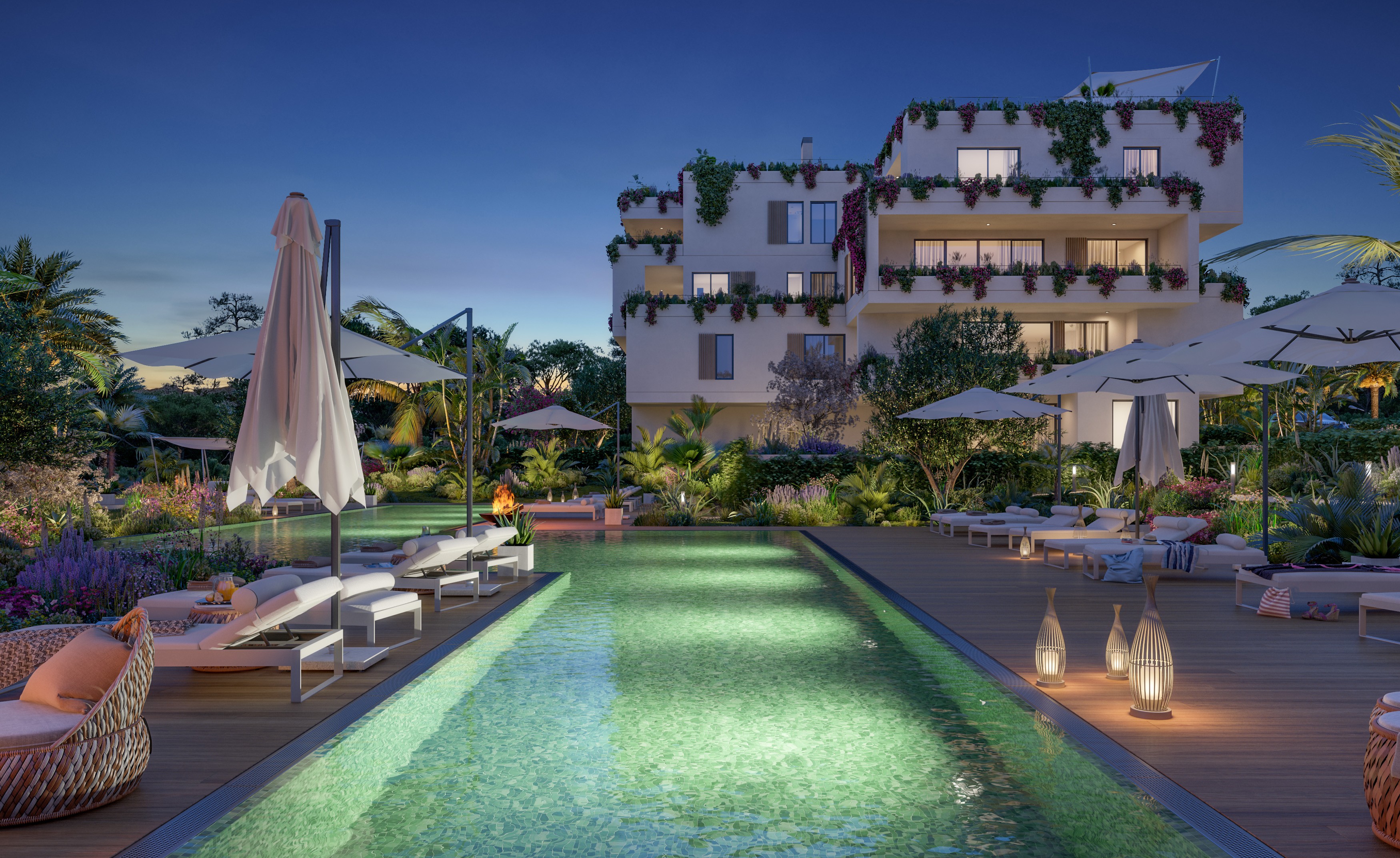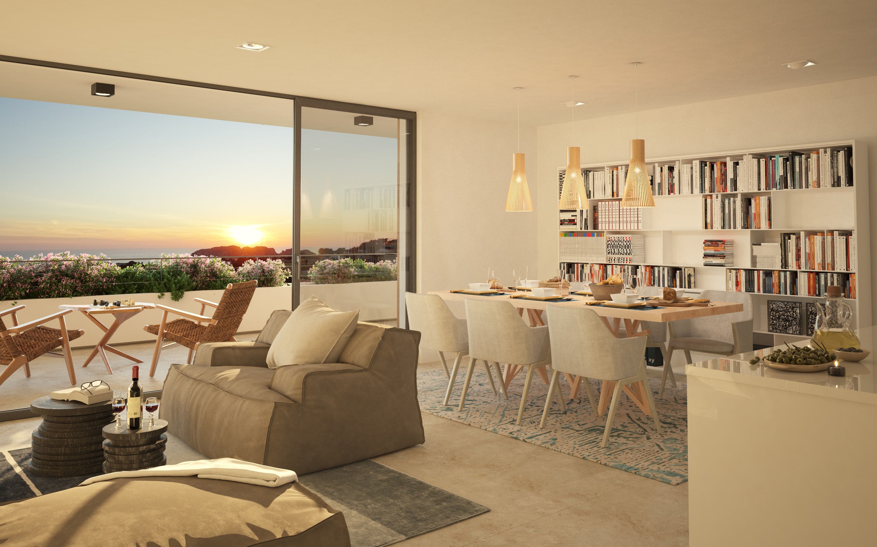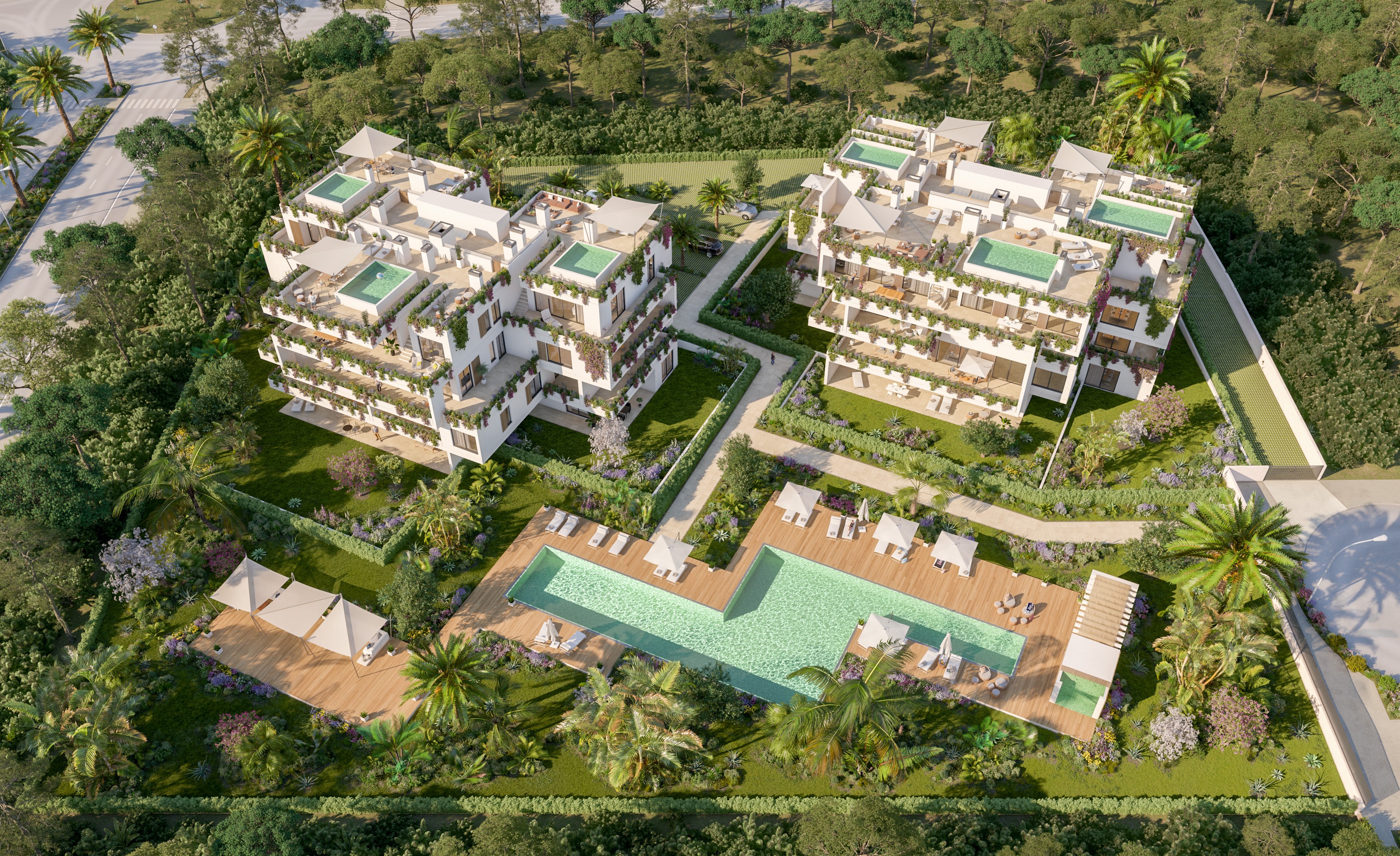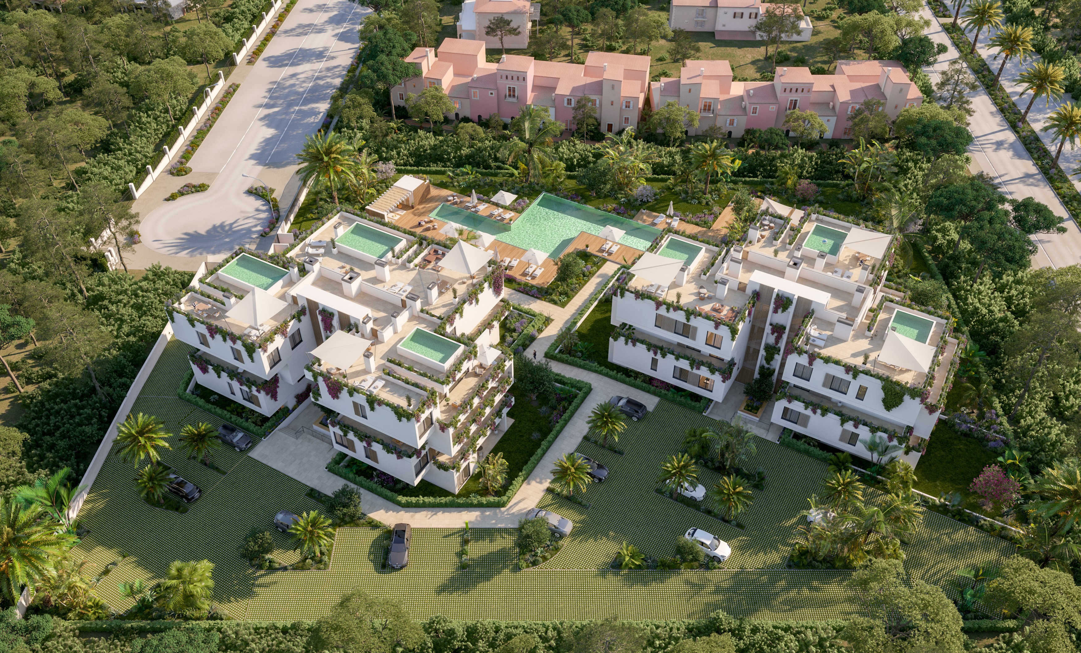 Voll ausgestattete Küche mit Kochinsel, doppelt verglaste Fenster, hochwertige Einbauschränke, Klimaanlage warm/kalt, Fußbodenheizung (Wärmepumpe), Natursteinfußboden, moderne Haustechnik (Domotika-System), Hauswirtschaftsraum, Alarmaanlage, Gäste-Toilette, Terrasse, Dachterrasse mit Pool und Grillplatz, Fahrstuhl, Gemeinschafts-Swimming-Pool auf Salzwasserbasis, Gemeinschaftsgarten, 2 x überdachter Pkw-Stellplatz.