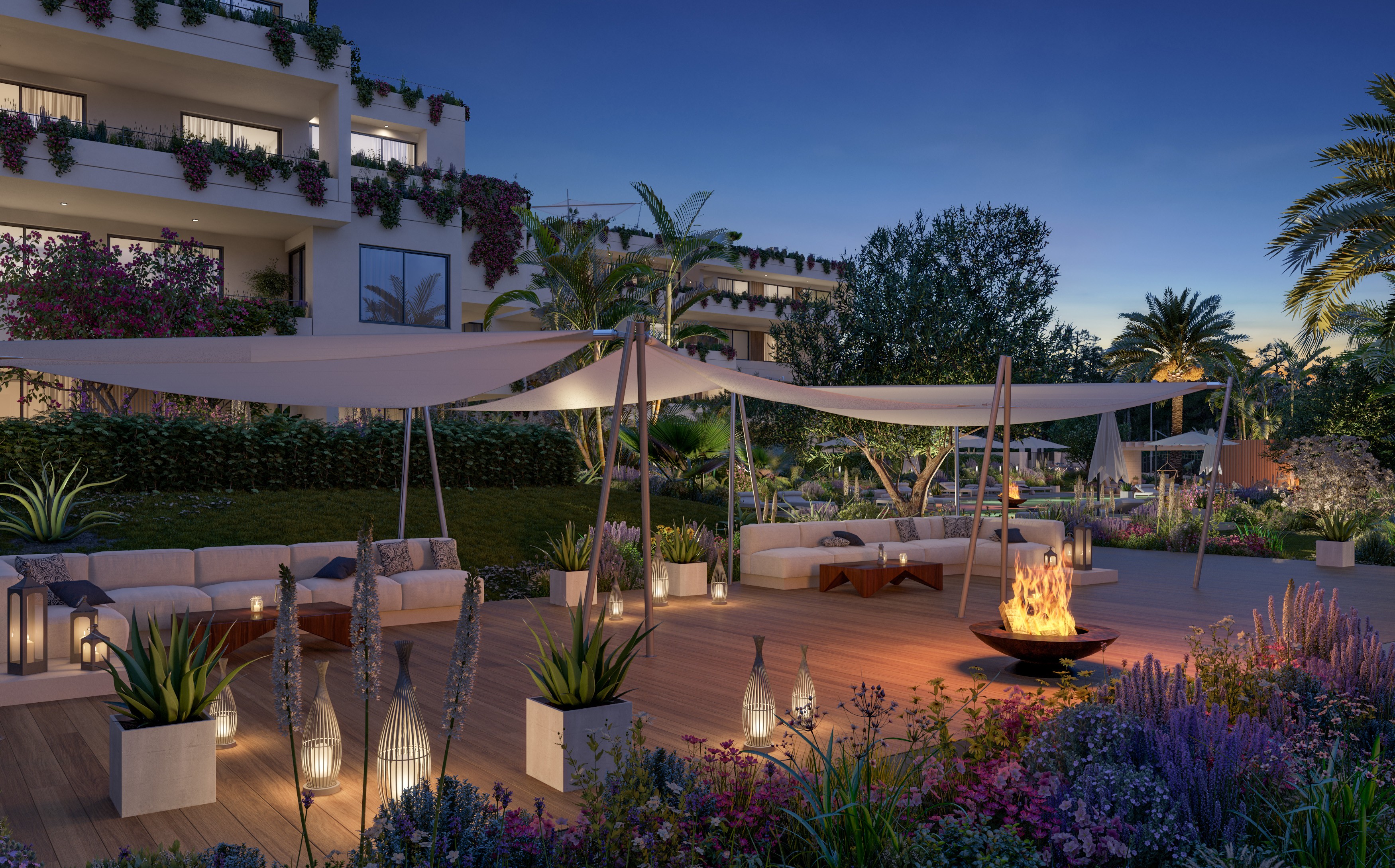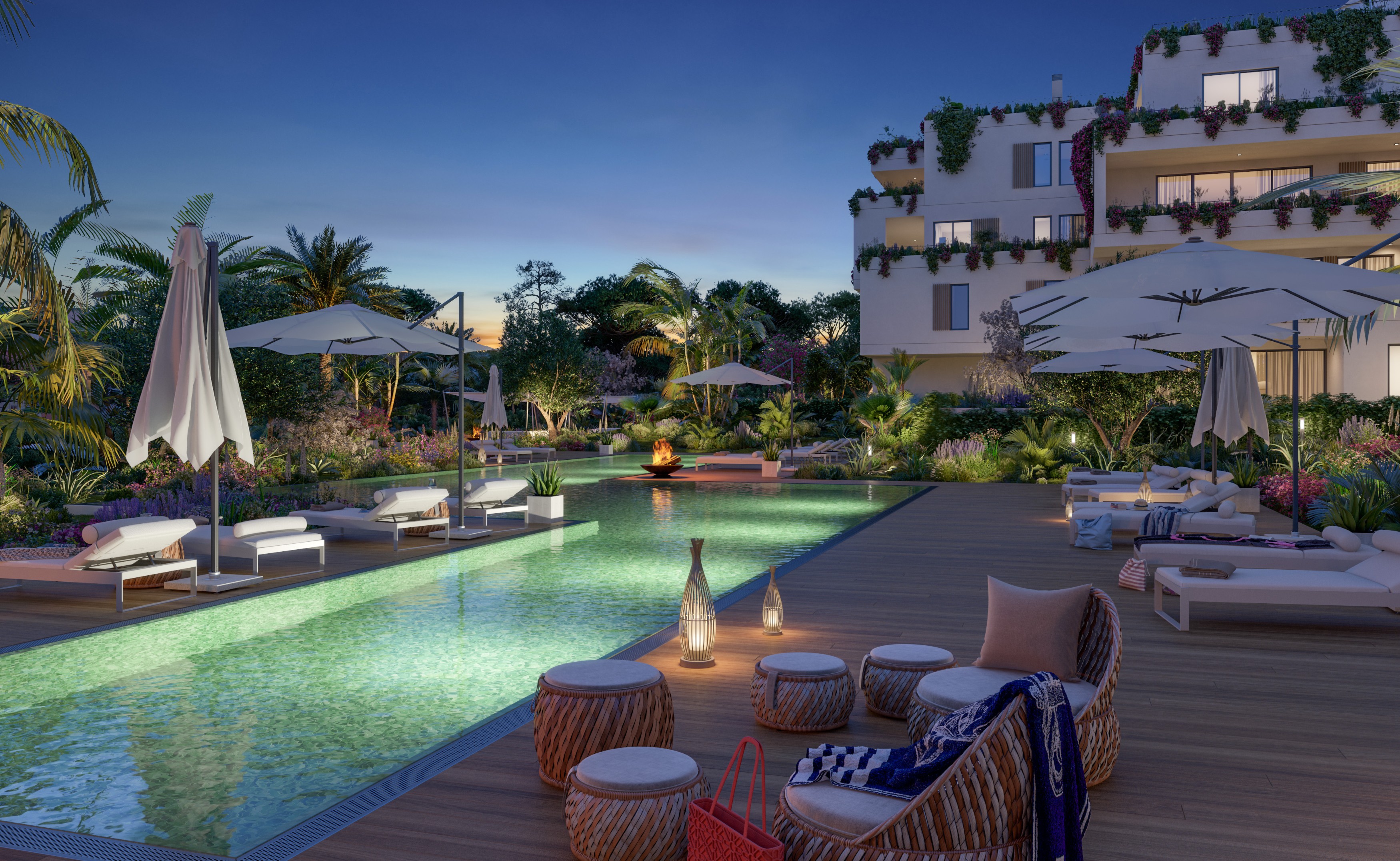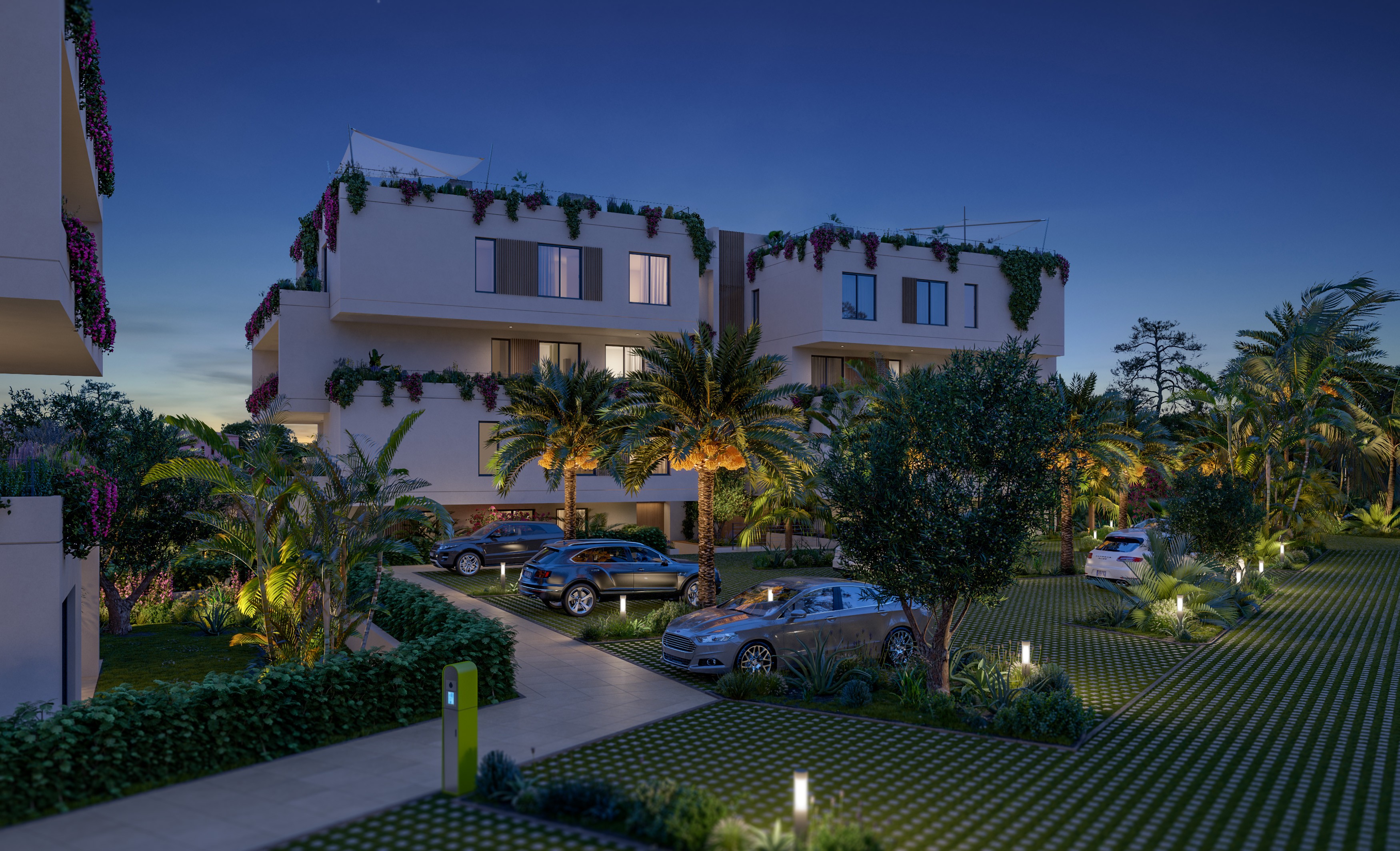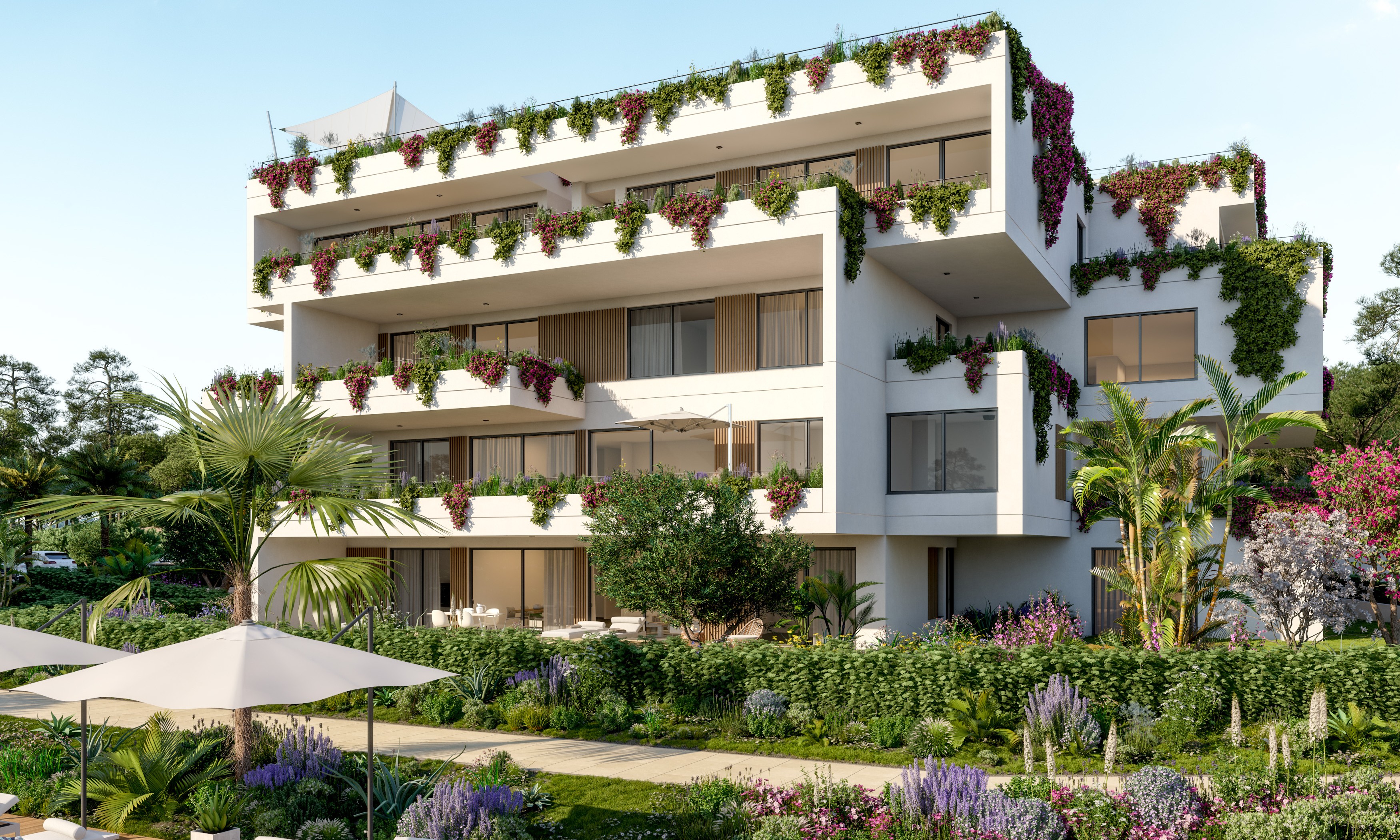 Voll ausgestattete Küche mit Kochinsel, doppelt verglaste Fenster, hochwertige Einbauschränke, Klimaanlage warm/kalt, Fußbodenheizung (Wärmepumpe), Natursteinfußboden, moderne Haustechnik (Domotika-System), Hauswirtschaftsraum, Alarmaanlage, Gäste-Toilette, Terrasse, Dachterrasse mit Pool und Grillplatz, Fahrstuhl, Gemeinschafts-Swimming-Pool auf Salzwasserbasis, Gemeinschaftsgarten, 2 x überdachter Pkw-Stellplatz.