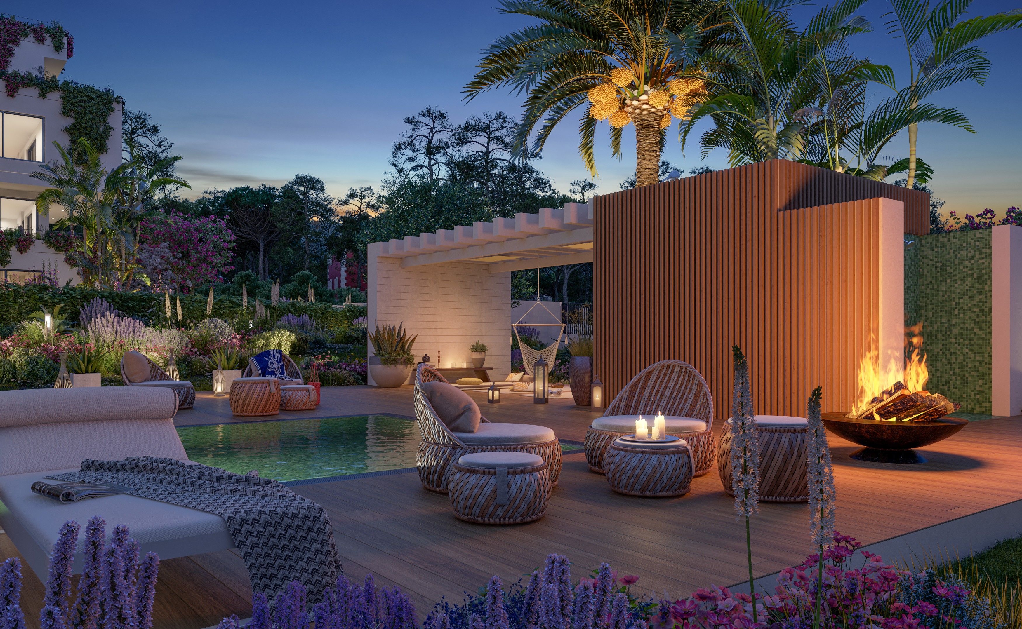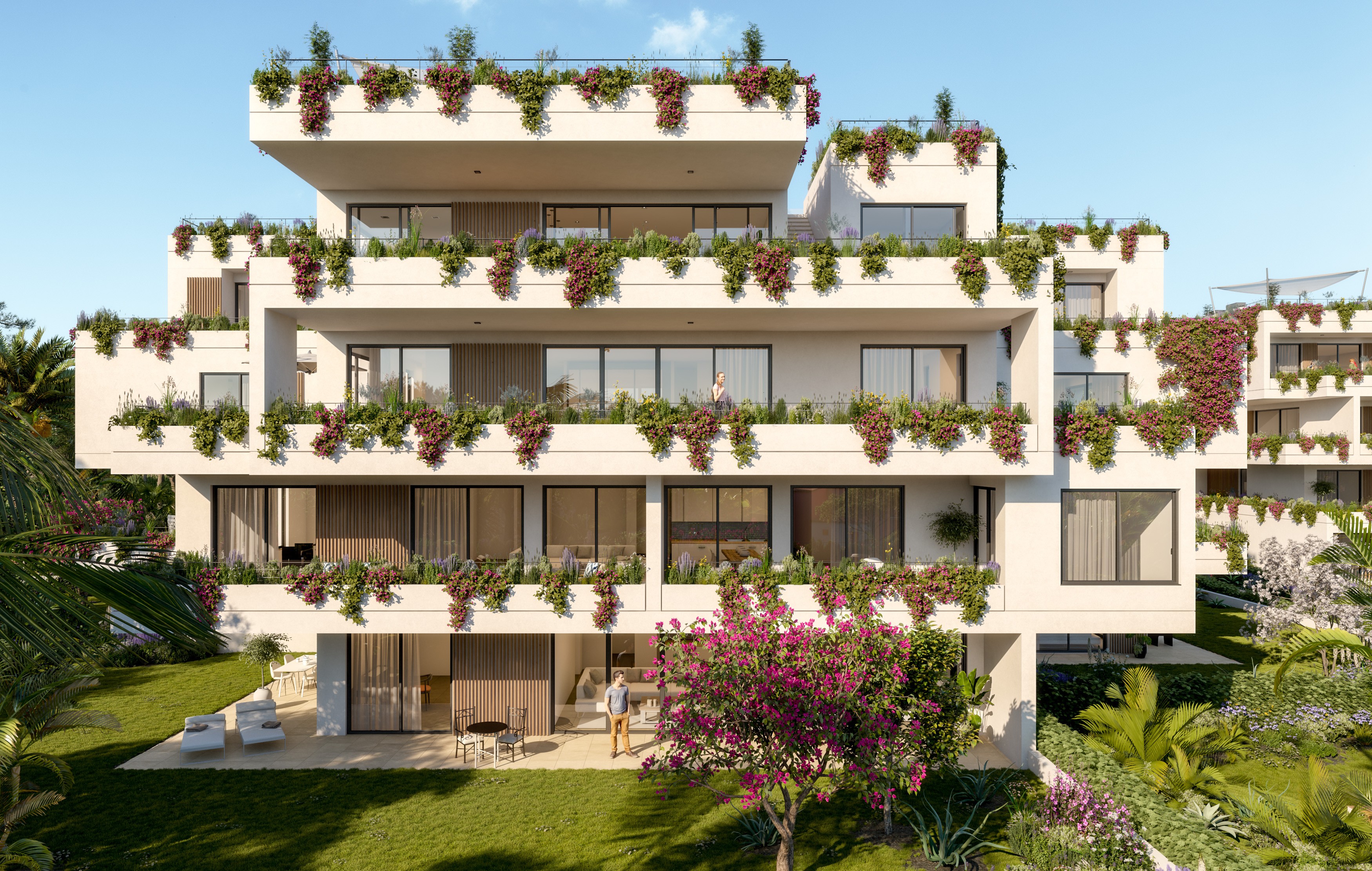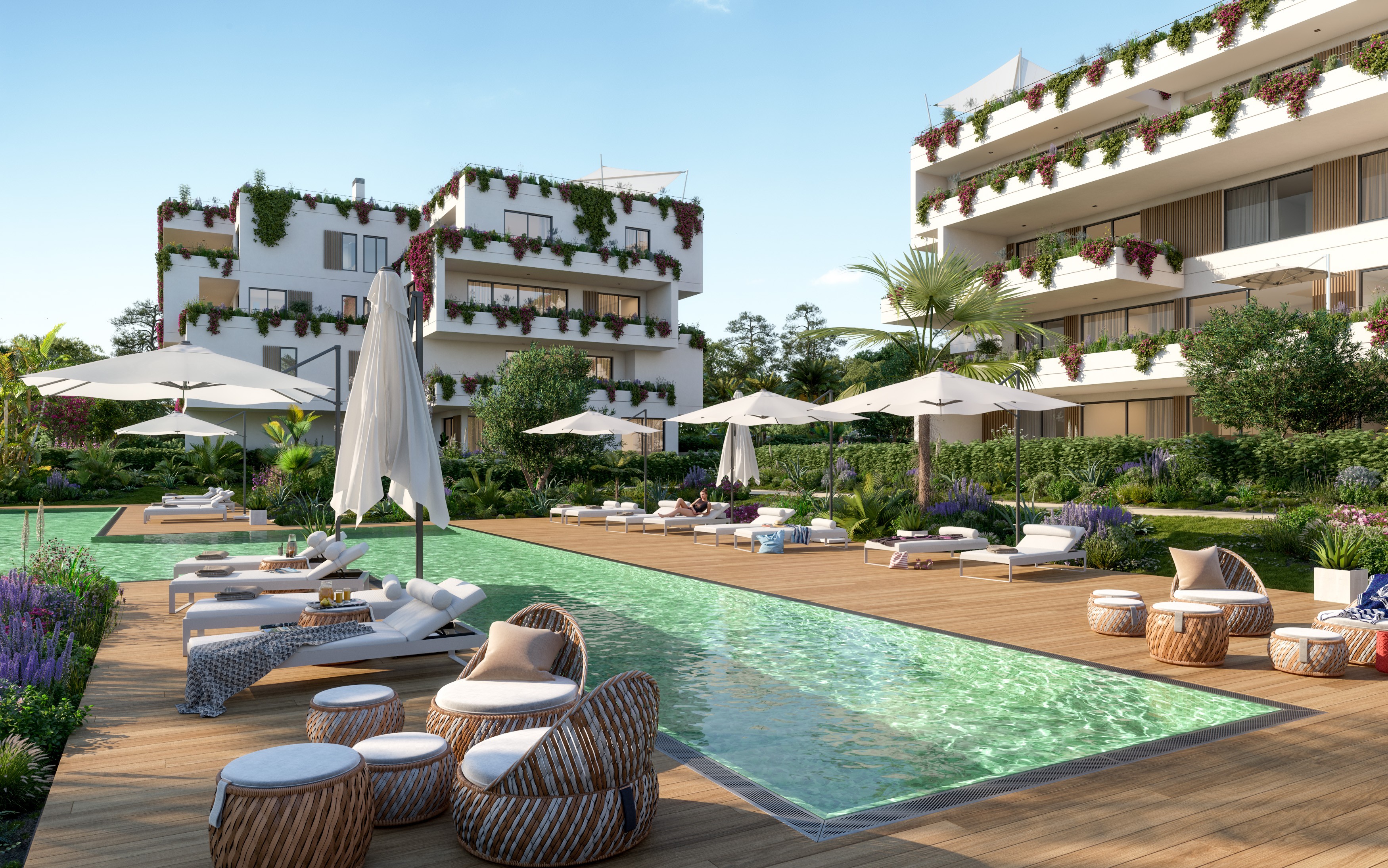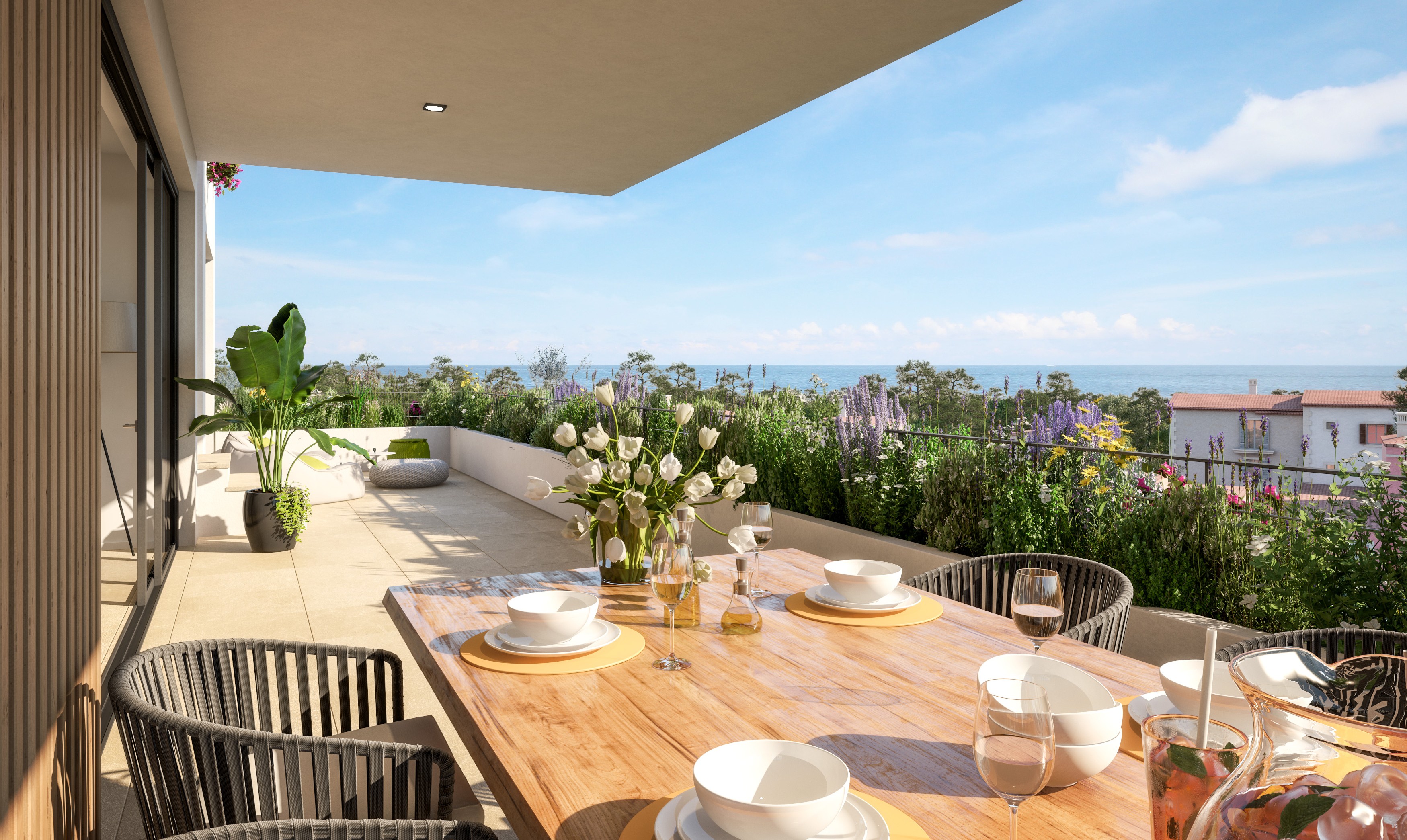 Voll ausgestattete Küche mit Kochinsel, doppelt verglaste Fenster, hochwertige Einbauschränke, Klimaanlage warm/kalt, Fußbodenheizung (Wärmepumpe), Natursteinfußboden, moderne Haustechnik (Domotika-System), Hauswirtschaftsraum, Alarmaanlage, Gäste-Toilette, Terrasse, Dachterrasse mit Pool und Grillplatz, Fahrstuhl, Gemeinschafts-Swimming-Pool auf Salzwasserbasis, Gemeinschaftsgarten, 2 x überdachter Pkw-Stellplatz.
