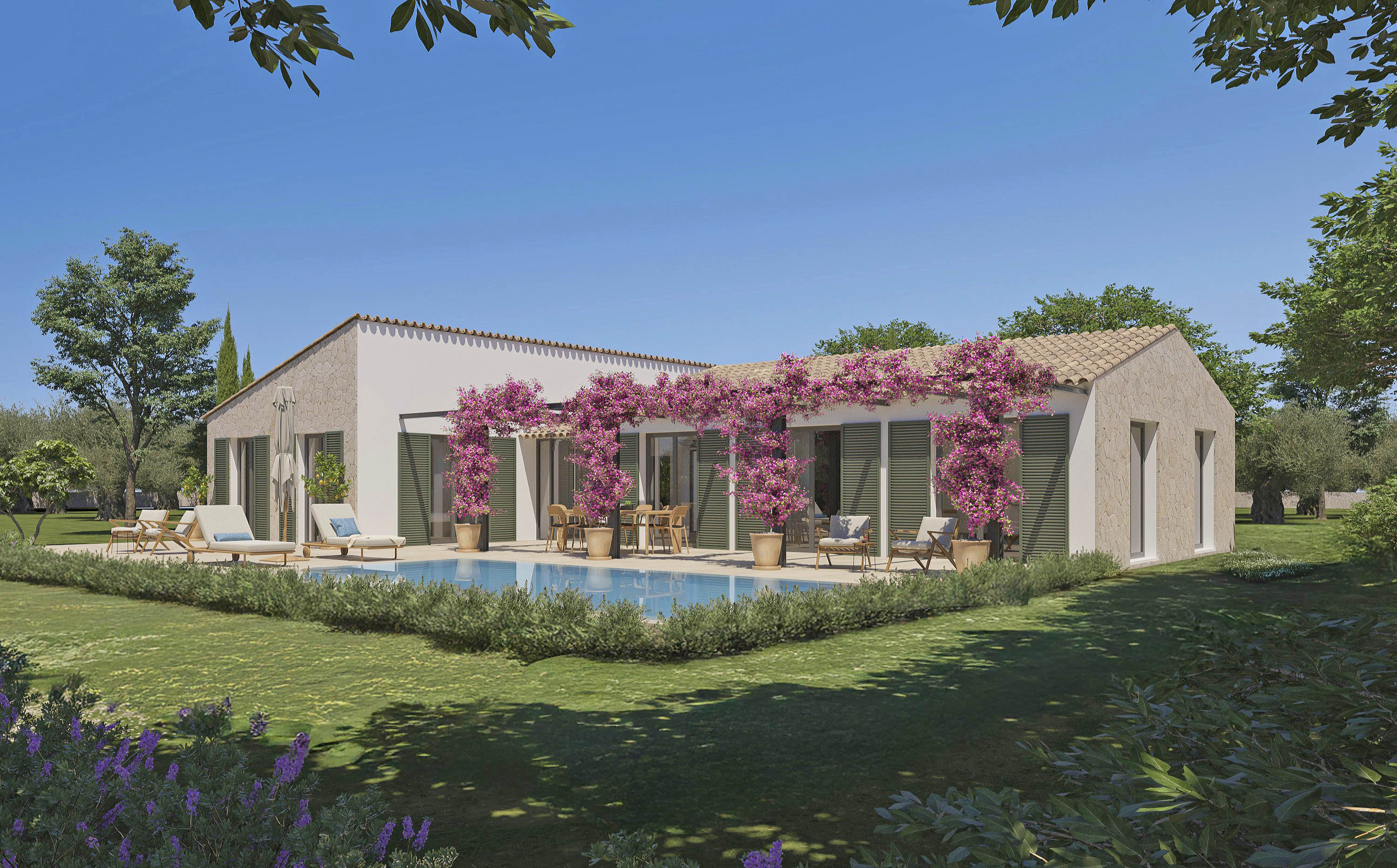 weiträumige Terrassen mit Pergola als Sonnenschutz
