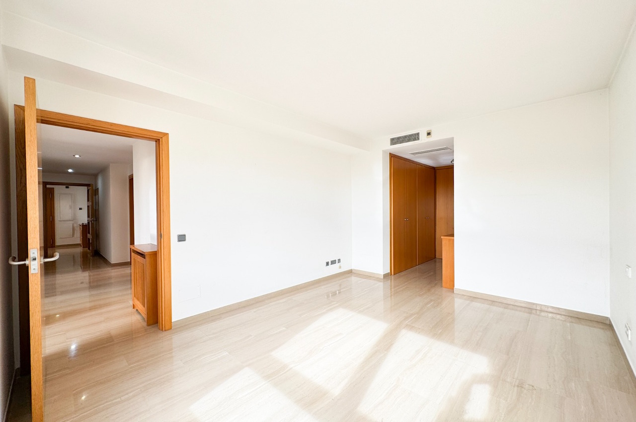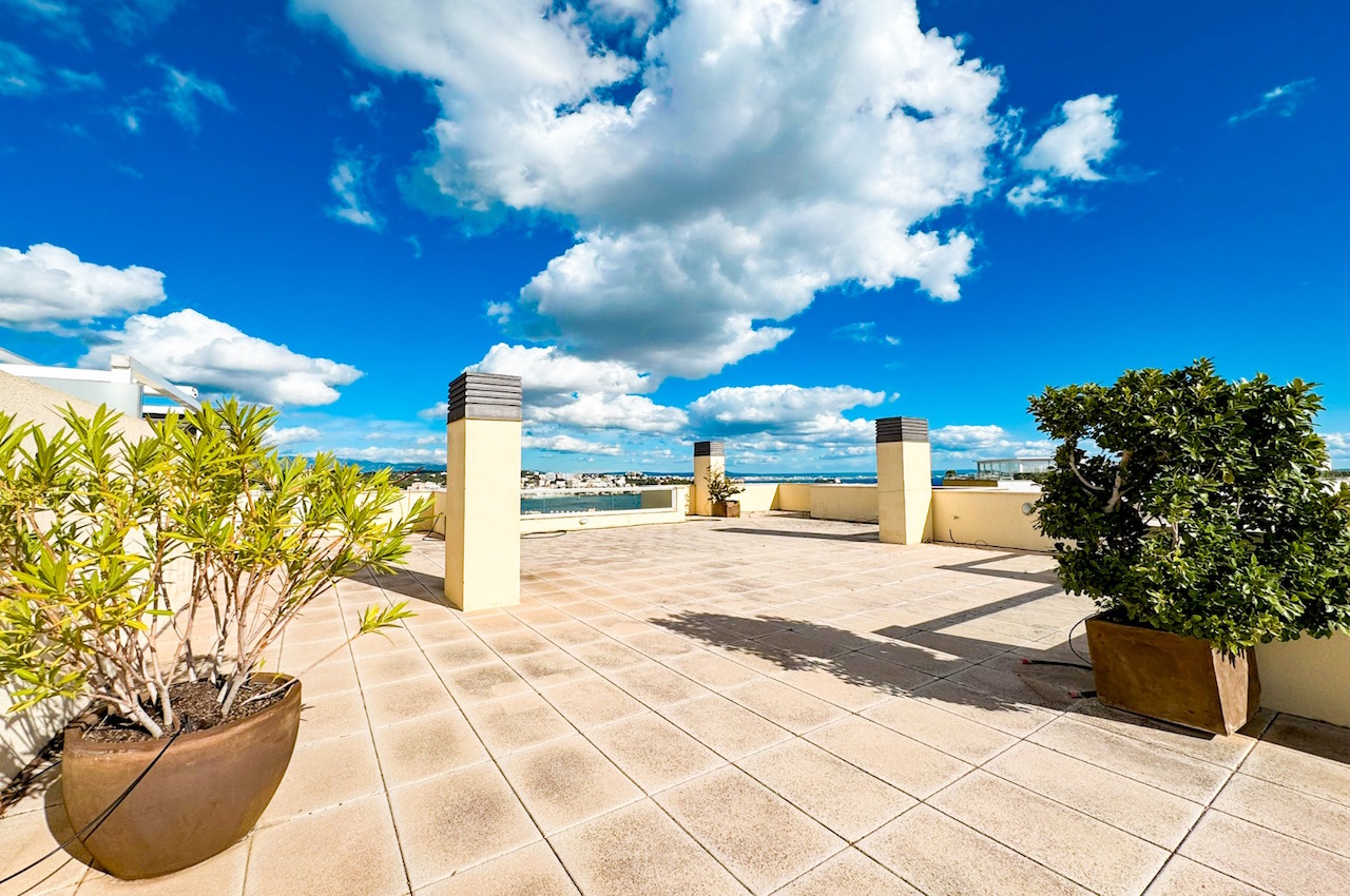 Dieses geräumige Penthouse bietet eine Wohnfläche von ca. 180 m² mit einem großen Wohn-/Esszimmer, einer voll ausgestatteten Küche und insgesamt vier Schlafzimmern und drei Badezimmern. Das Wohnzimmer öffnet sich zu einer 15 m² großen, überdachten Terrasse in Südwestlage, die zur beeindruckenden privaten Dachterrasse von ca. 130 m² führt – ideal zum Entspannen, Sonnenbaden oder um unvergessliche Sonnenuntergänge mit Meerblick zu genießen. Die im mediterranen Stil erbaute und hochwertig ausgestattete Residenz bietet einen schönen Gemeinschaftspool und perfekt gepflegte Gemeinschaftsgärten. Zwei Tiefgaragenstellplätze und ein Abstellraum runden das Angebot ab.