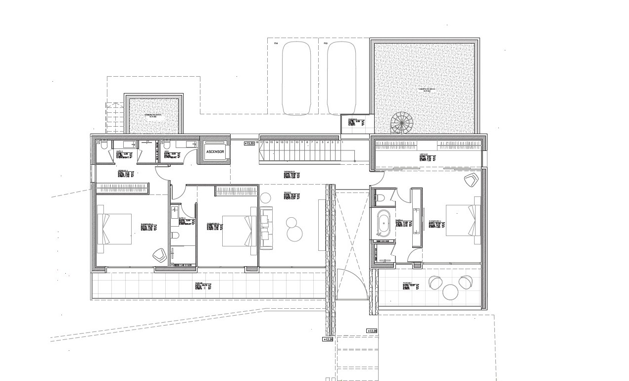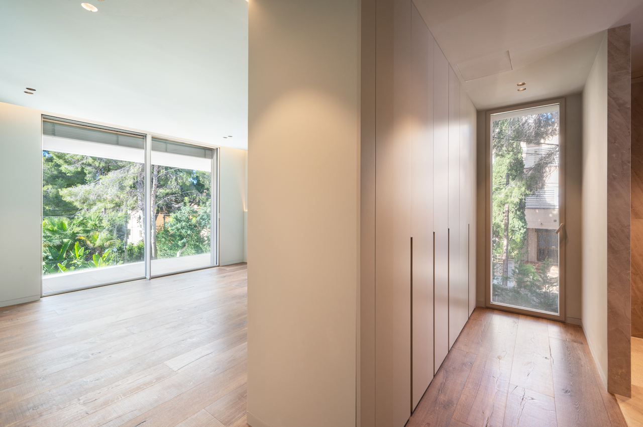 Diese im Jahre 2025 auf einem 1.322 m2 Grundstück unter Verwendung hochwertige Bau- und Ausstattungsmaterialien erbaute Luxus-Villa in Santa Ponsa mit einer Fläche von 731 m2 beeindruckt bereits beim Zugang durch eine 6 Meter hohe Eingangsür die in den Hauptwohnbereich übergeht, wo sich das Wohnzimmer mit Kamin, ein schöner Essbereich mit einer offenen Luxusküche mit Kochinsel und einer anliegenden Service-Küche befinden. Auf dieser Ebene befindet sich ebenso ein Gästezimmer mit Badzimmer en Suite und ein Büro. Auf der oberen Wohnebene befinden sich das Hauptschlafzimmer mit Badezimmer en Suite, Ankleide und eigener Terrasse, zwei weitere Schlafzimmer mit Badezimmer en Suite, ein weiterer kleiner Wohnbereich (z.B. TV-Bereich) und eine Gäste-Toilette. Im Untergeschoss stehen ein imposanter Spa-Bereich mit Sauna & Hammam, einem Fitnessraum, einem Indoor-Swimming-Pool und einem Kinoraum zur Verfügung. Ein Fahrstuhl verbindet alle Wohnebenen miteinander! Ein enorme Dachterrasse, Parkmöglichkeiten für mehrere Pkw und Carport, weiträumige offene und überdachte Terrassen und ein Swimming-Pool, eingebettet in einen schönen Garten mit