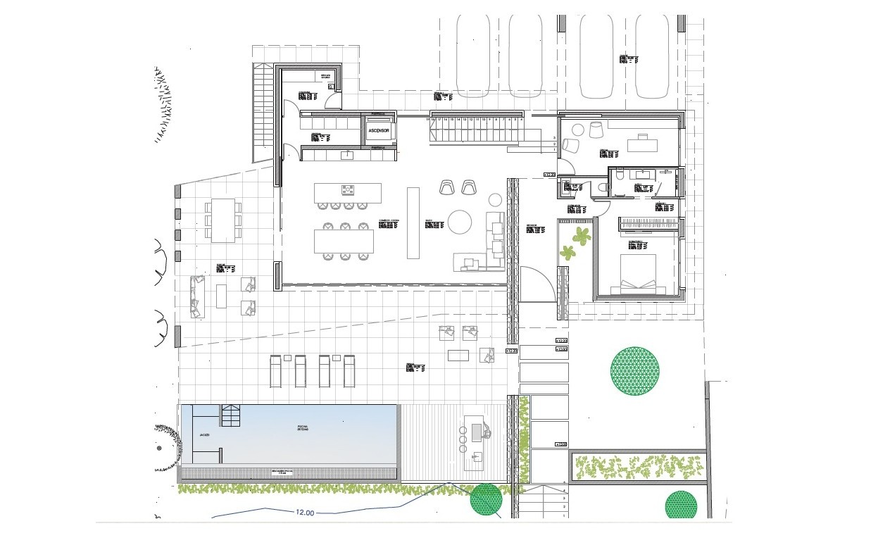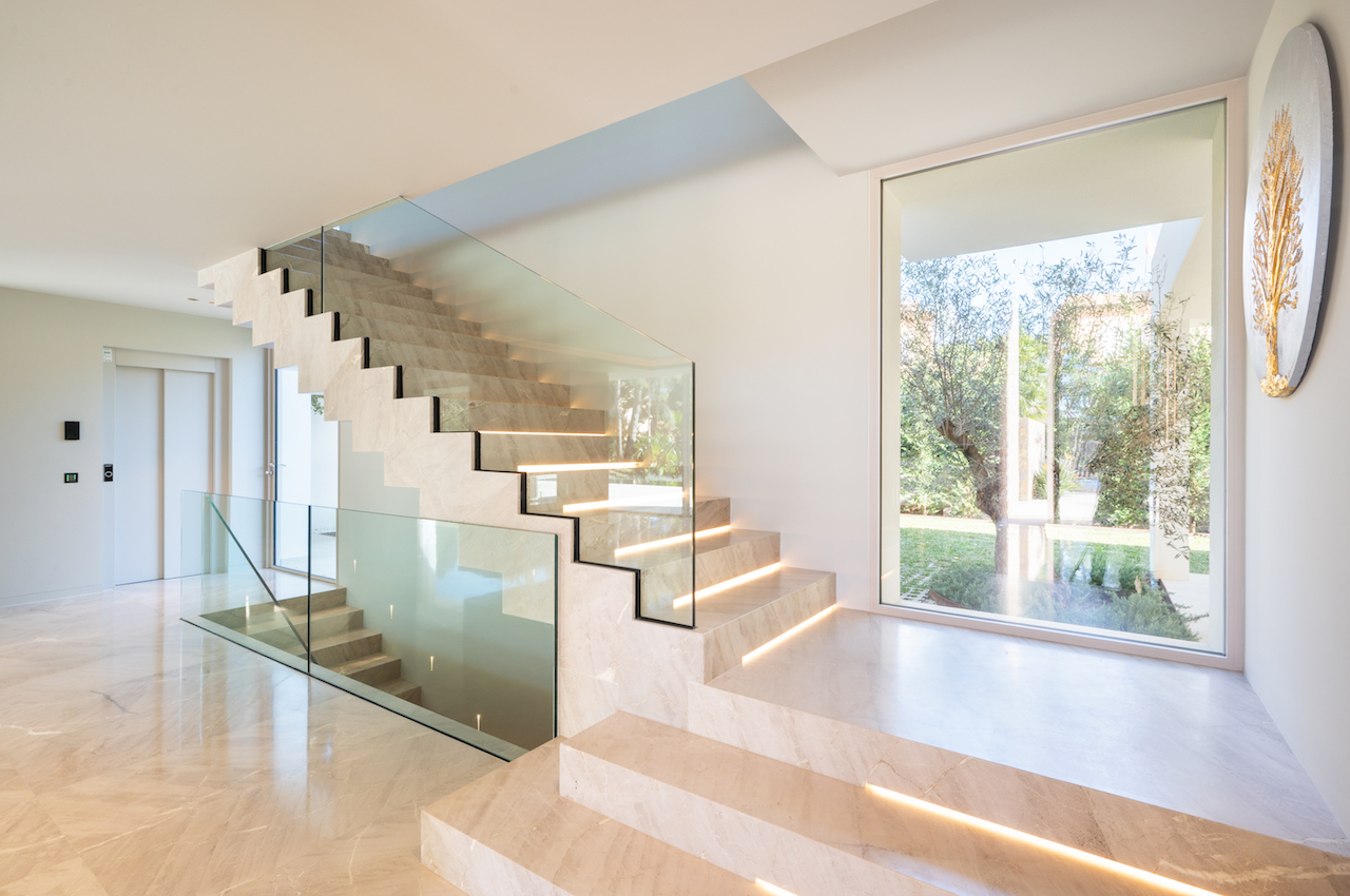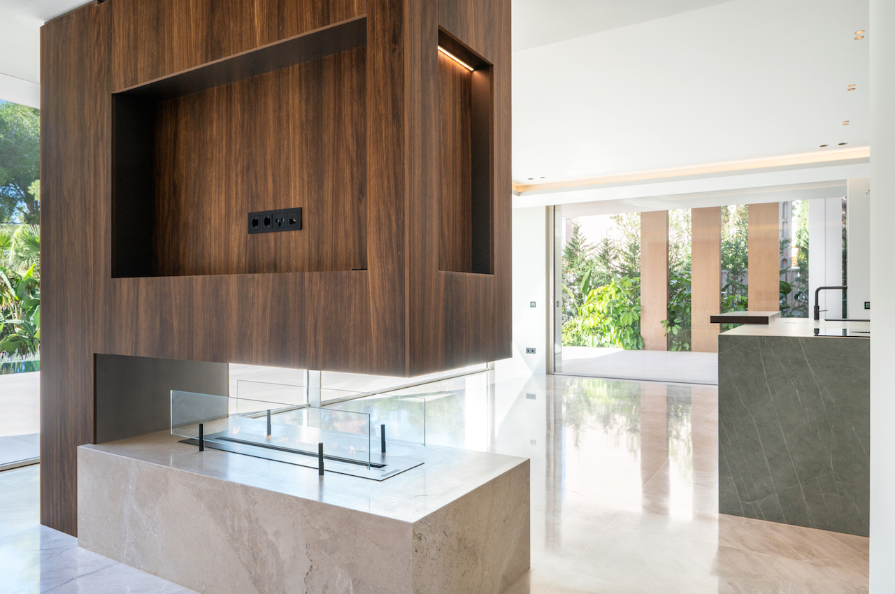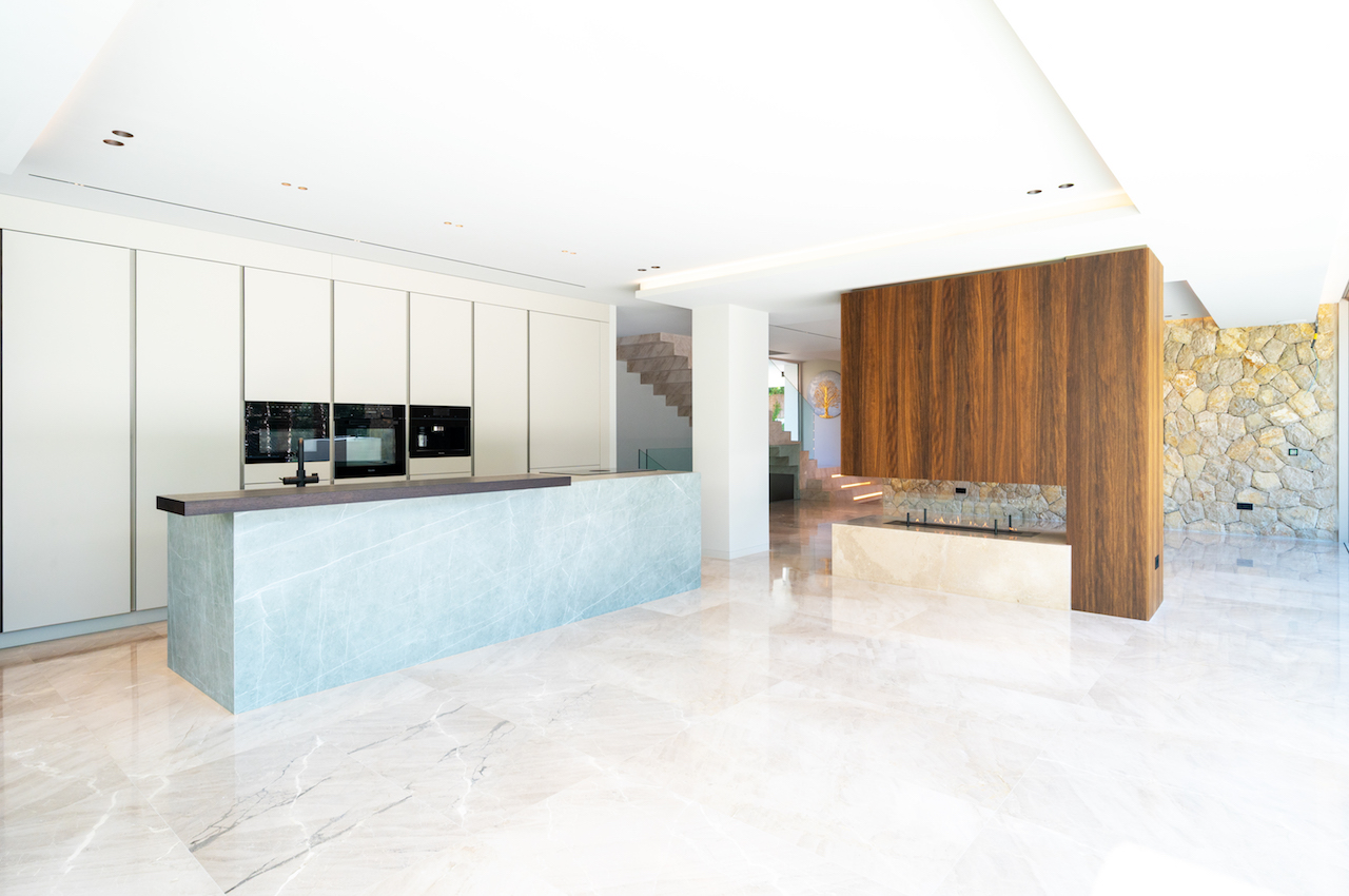 Voll ausgestattete Neolith-Designerküche mit Miele-Geräten, Büro, 2. Wohnzimmer, Gäste-Toilette, doppelt verglaste Fenster, Einbauschränke, Kiimaanlage, inteligente Haustechnik, SAT TV, Kamin, Fußbodenheizung, Esszimmer,Badezimmer mit Armaturen von Gessi, Antonio Lupi und Sanitäranlagen von Villeroy & Boch, Wellnessbereich mit Sauna, Hammam und Fitnessraum, Kinoraum, weiträumige überdachte und freie Terrassen, Garten mit automatischer Bewässerung, 40 m² Infinity-Pool mit Whirlpool, KNX-Hausautomationssystem, Pkw-Stellplatz & Carport.