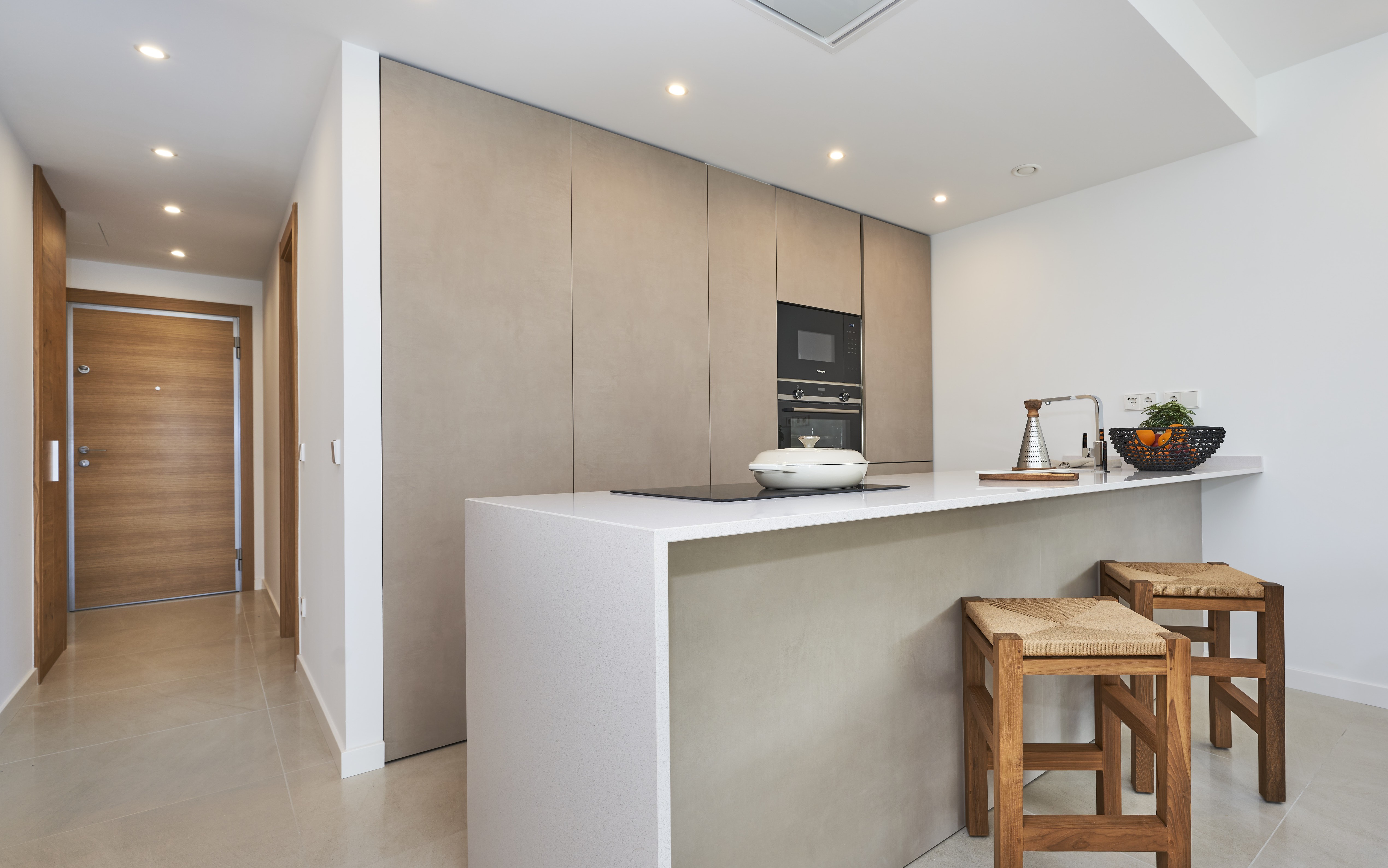 Moderne Küchen: Helle, voll ausgestattete Küchen mit erstklassigen Geräten (Backofen, Induktionskochfeld, Dunstabzugshaube) und passenden Arbeitsplatten. Zur Ausstattung gehören außerdem ein Kühlschrank und ein Geschirrspüler, beide mit integrierten Fronten, Mikrowelle, ein Ofen und ein Induktionsherd der Marke Siemens sowie ein deckenmontierter Dunstabzug.