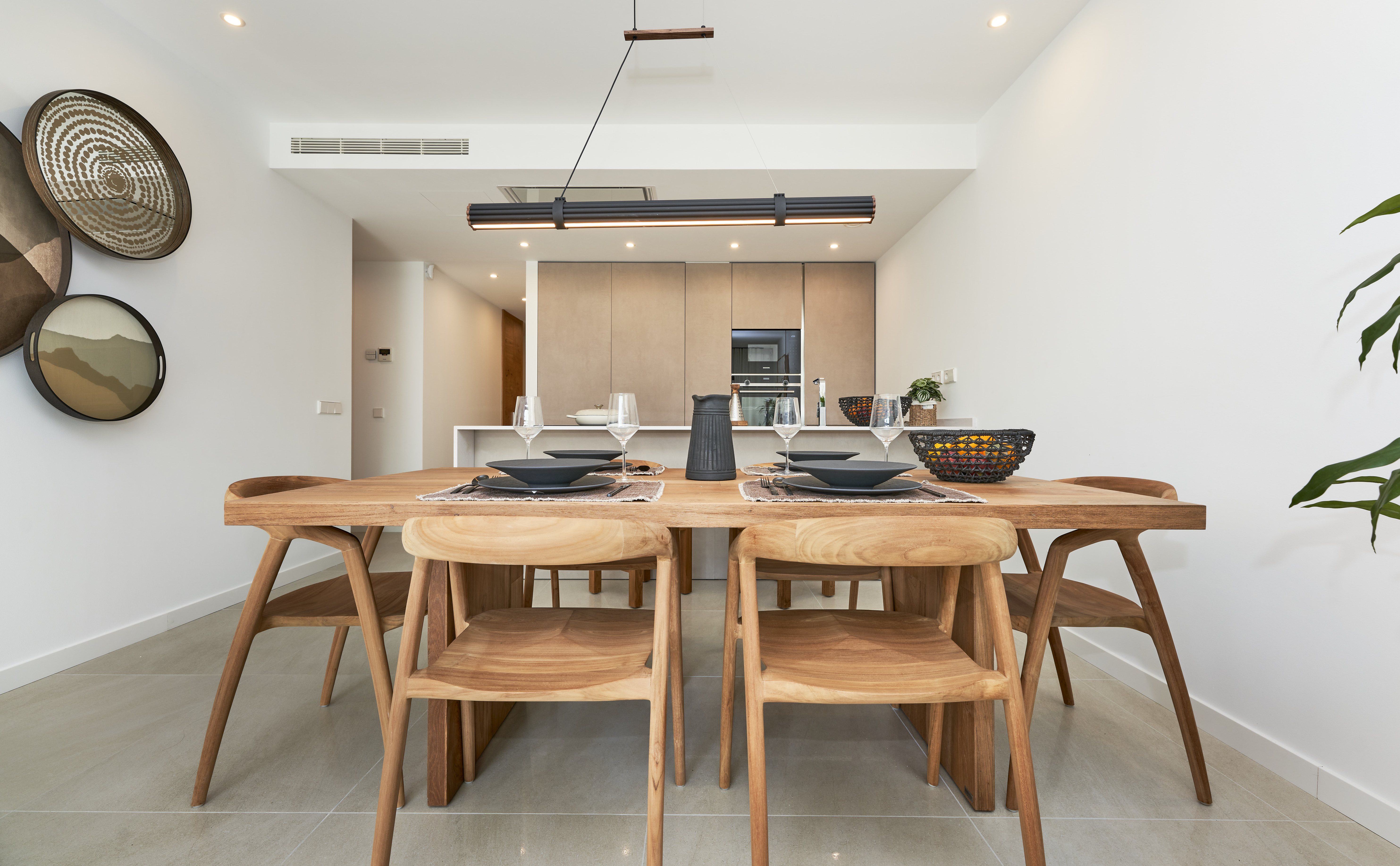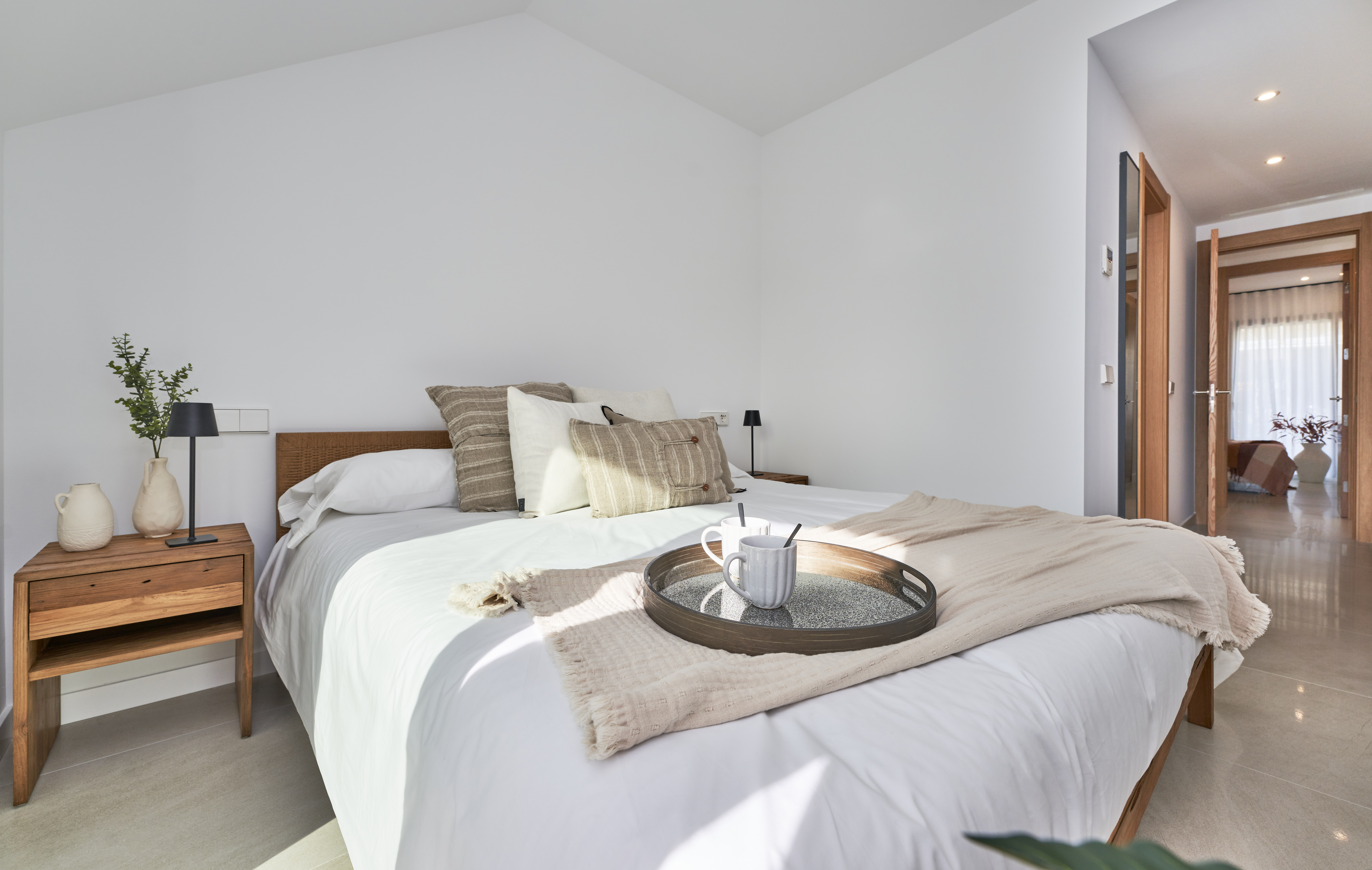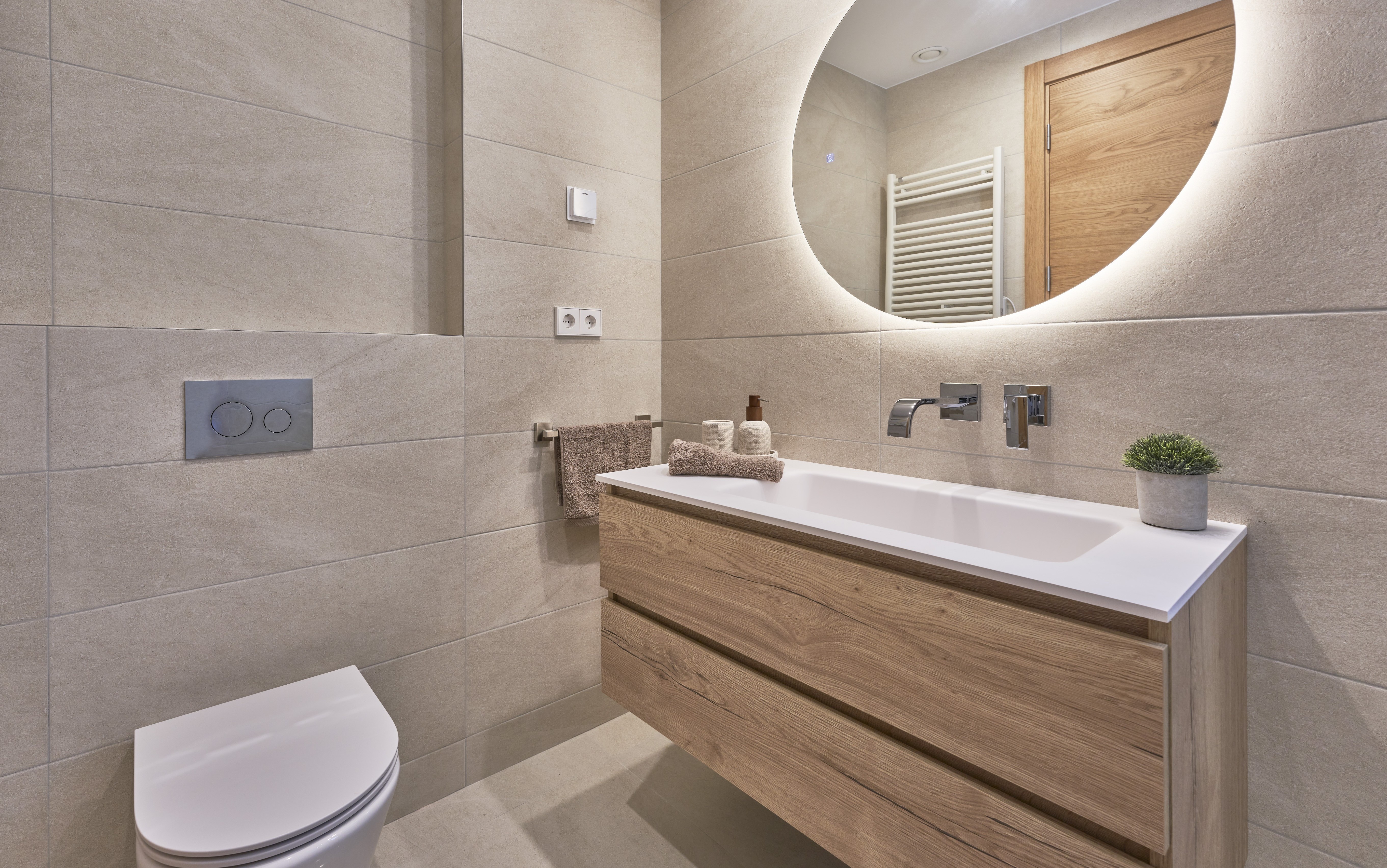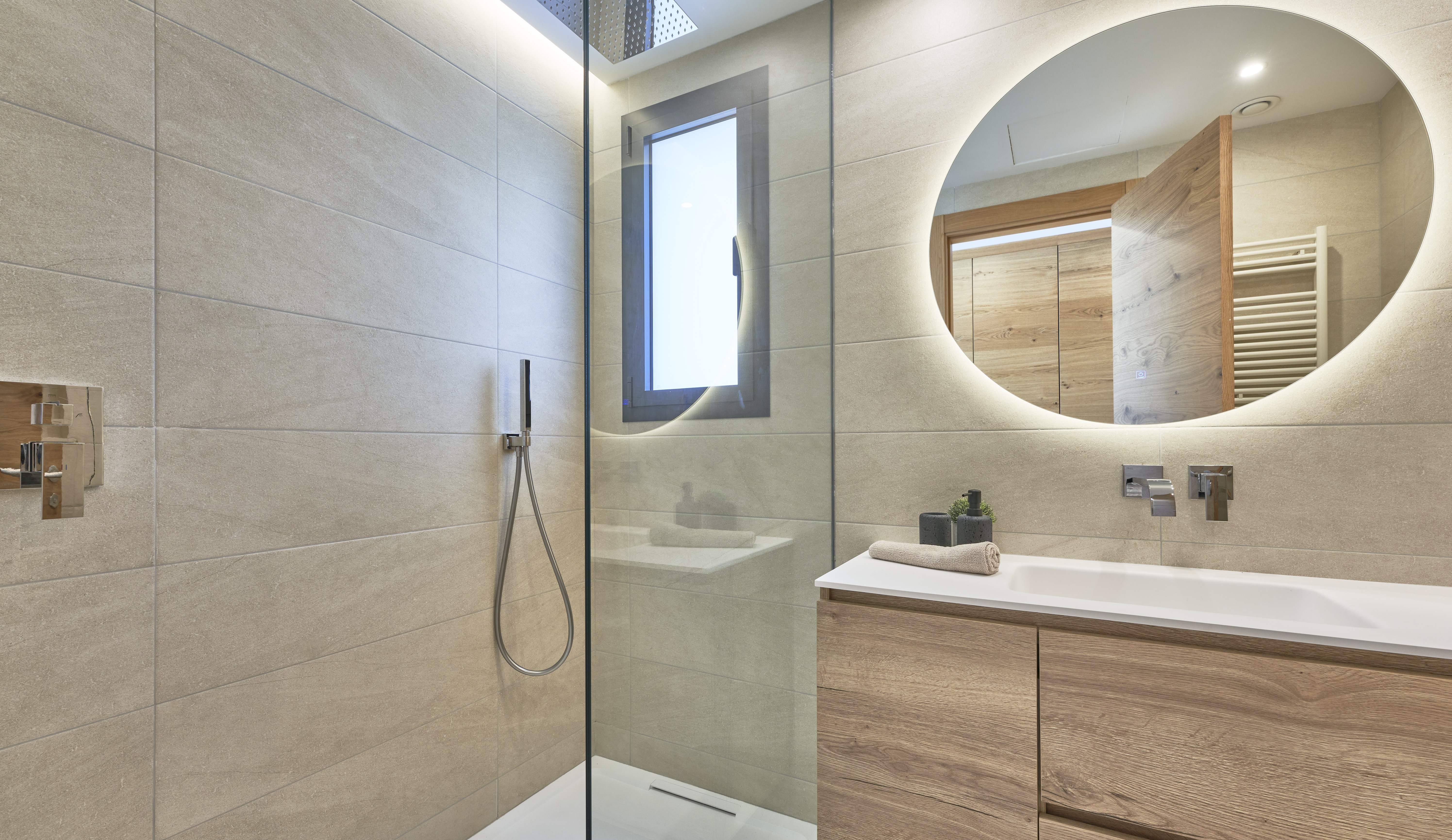 Elegante Bäder: Ausgestattet mit schwebenden Holzunterschränken, bodengleichen Duschen und hochwertigen Armaturen von Tres. Die Bäder der außenliegenden Wohnungen haben ein Fenster und dadurch Tageslicht. Sowohl das Haupt- als auch das zweite Badezimmer verfügen über eine elektrische Fußbodenheizung.